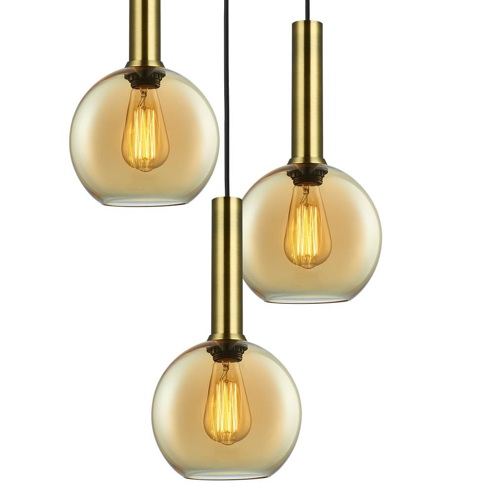 Lámpara colgante Bolo 3L ámbar con tres luces E27 y tulipas de cristal ámbar, ideal para iluminar salones, comedores o cocinas con luz ambiental cálida y acogedora. Su diseño elegante aporta un estilo moderno y decorativo que realza cualquier estancia interior