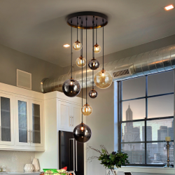 Lámpara de techo Schuller DARK de 9 luces en metal negro mate con detalles en latón satinado y bolas de cristal en ámbar y smoke espejado (Ø10/12/20 cm). Incluye 9 LED G9 4W, 3600 lm .Altura regulable 75–200 cm y tacos de vuelco incluidos.