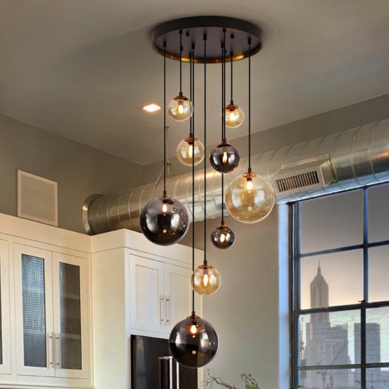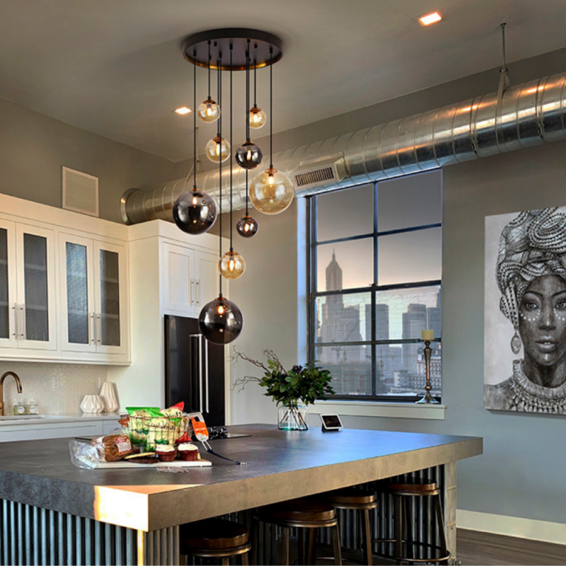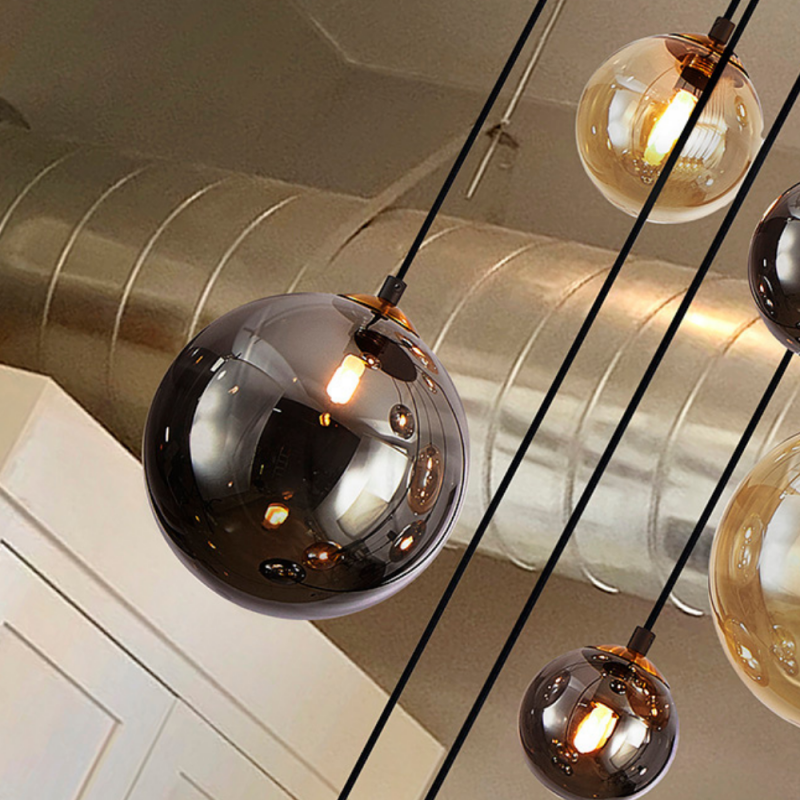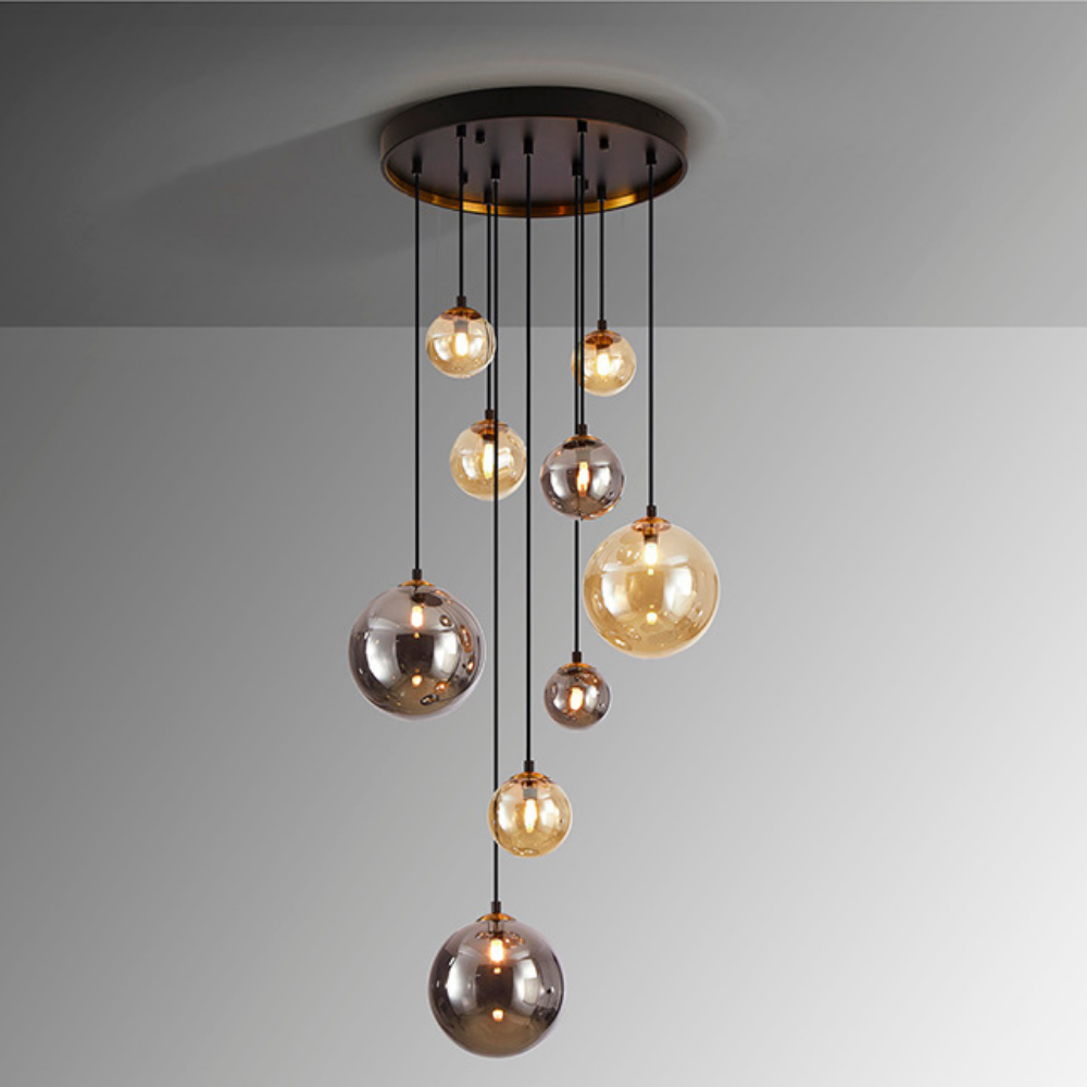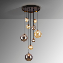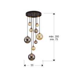 La lámpara de techo colgante DARK de Schuller es una pieza de estilo contemporáneo con un marcado carácter decorativo, ideal para vestir con personalidad salones, comedores y recibidores. Está realizada en metal acabado negro mate con detalles en latón satinado, y se completa con un conjunto de tulipas esféricas de cristal en dos acabados muy elegantes: ámbar y gris smoke espejado, creando un juego de reflejos sofisticado tanto encendida como apagada. Las esferas se combinan en tres tamaños (Ø10, Ø12 y Ø20 cm) para aportar volumen y dinamismo al conjunto. Incluye 9 puntos de luz con bombillas LED G9 de 4W (incluidas), ofreciendo un flujo total de 3.600 lúmenes y CRI 80, perfecto para lograr una iluminación potente y agradable en el día a día. Es apta para interior (IP20) y cuenta con Clase eléctrica I. Además, es regulable en altura (altura instalada aprox. 75–200 cm máx.) para adaptarse a distintos techos y composiciones, por ejemplo sobre una mesa de comedor o en el centro del salón. Para una fijación más segura, se suministra con tacos de vuelco con balancín. También existe versión a 110V