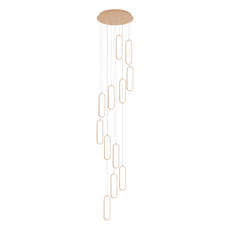 Lámpara colgante Durbuy LED 80W con diseño moderno de aros suspendidos, temperatura de color regulable 3CCT y mando a distancia y APP. Acabado champán, ideal para salones y espacios con techos altos. Ø 40 cm.
