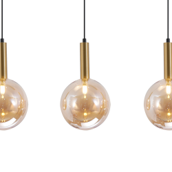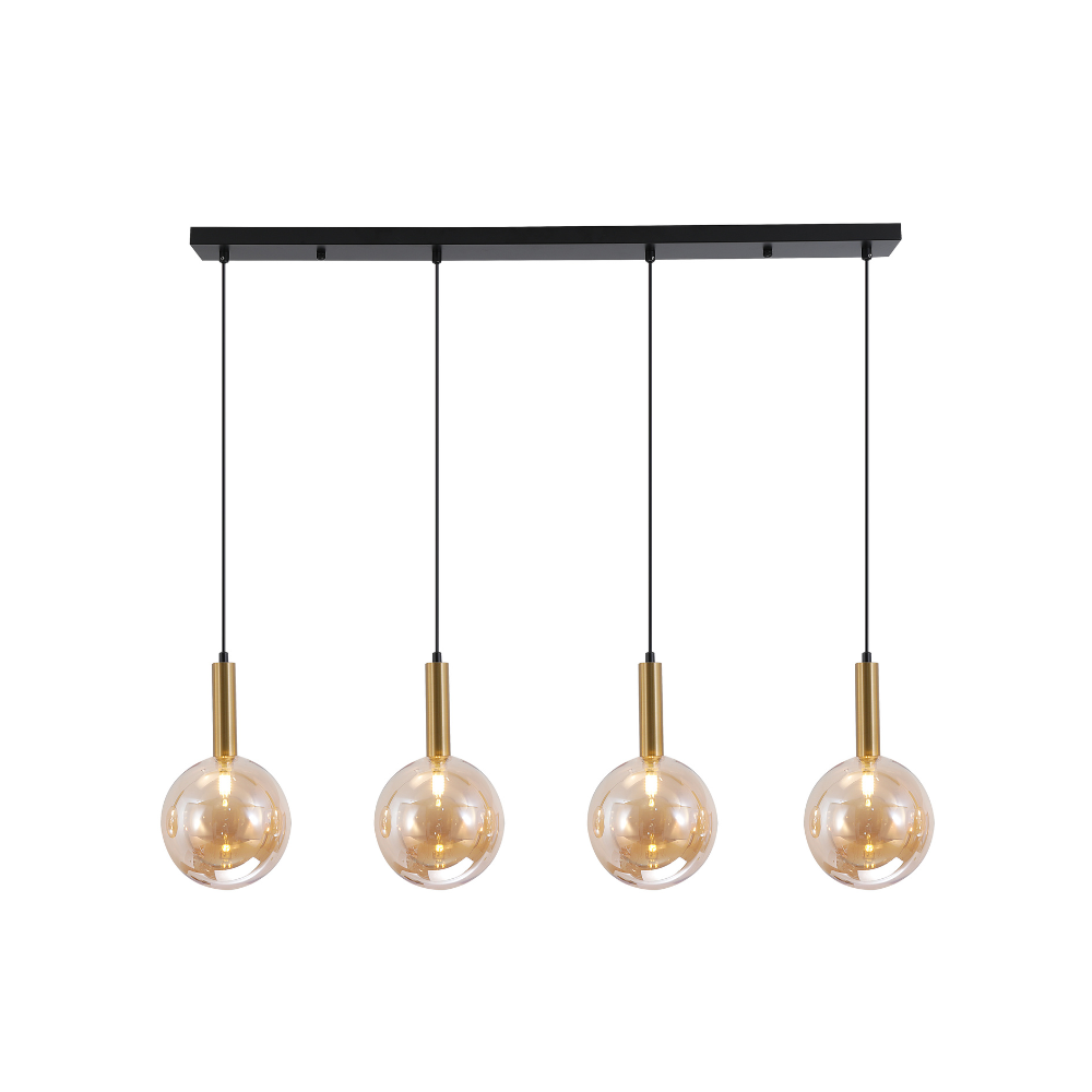 Lámpara colgante Eris Lineal de estilo moderno con 4 luces. Tulipas de cristal ámbar y cuerpo de aluminio en negro y dorado. Ideal para comedores, cocinas o salas. Compatible con bombillas G9.