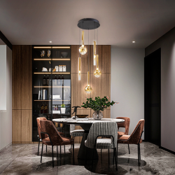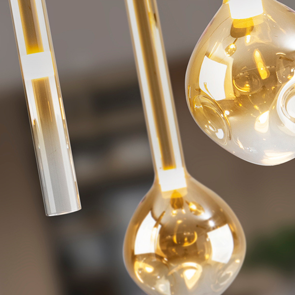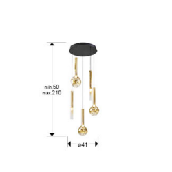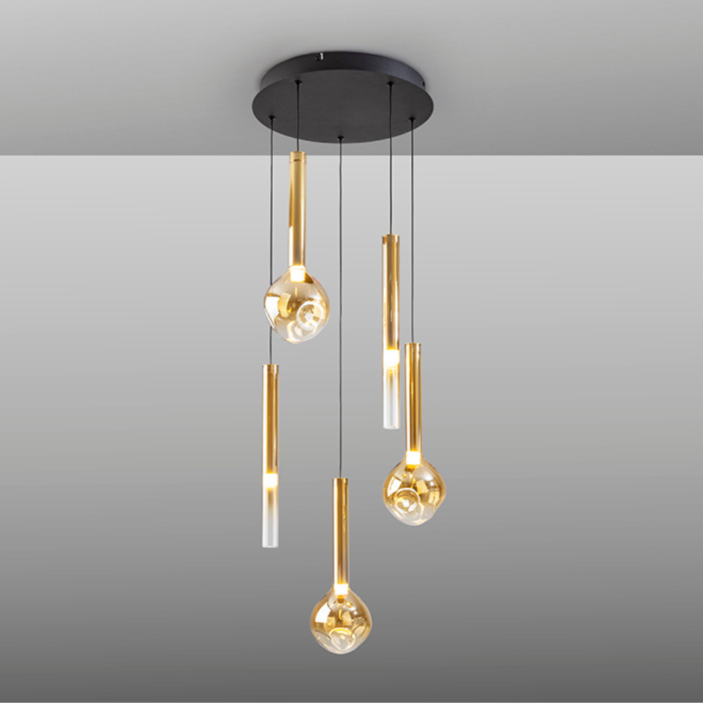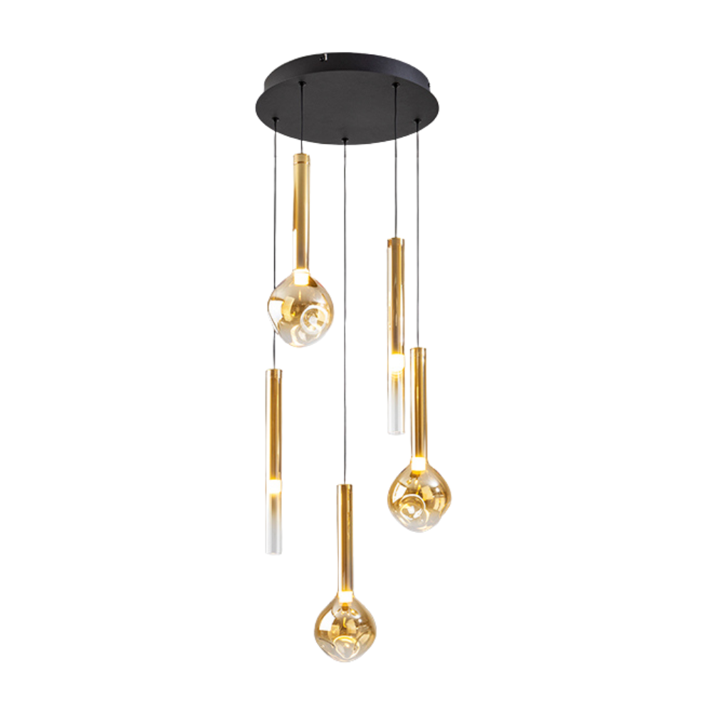 La colección Essenza es decorativa y con estética moderna. La lámpara de techo colgante es perfecta para aportar carácter a salones, comedores o recibidores. Su estructura de metal en acabado negro mate con detalles dorados se combina con 5 tulipas de vidrio ámbar con degradado hacia transparente, creando un efecto cálido y elegante tanto encendida como apagada. Incorpora LED integrado de 20W, con luz cálida 3000K y un flujo de 1.200 lúmenes, ideal para generar una iluminación ambiental agradable y confortable. Además, está preparada para adaptar la intensidad a cada momento gracias a su driver regulable TRIAC y 0-10V, pudiendo utilizarse con un regulador de pared LED compatible con estas tecnologías (regulador no incluido). Su instalación permite altura regulable a la hora de la instalación (de 50 cm hasta 210 cm), lo que facilita colocarla sobre mesas de comedor, barras o en espacios con techos altos, ajustando la caída a la composición del ambiente. Con un cuerpo principal de Ø41 cm y 36 cm de alto, es una lámpara con presencia, equilibrada y muy decorativa.