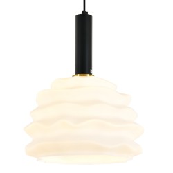 La lámpara Freya tiene un diseño moderno y artístico. La característica más llamativa es su tulipa, que tiene un estilo orgánico y fluido, con una serie de pliegues ondulados. El material de la tulipa es cristal blanco opaco, lo que permite que la luz se difunda de manera suave, creando una iluminación cálida. La medida de su tulipa es de 30cm Ø x 35cm altura. El soporte de la lámpara es de metal negro mate, con un cilindro que conecta la pantalla al cable colgante de textil negro. La base que se fija al techo es también negra y circular. La altura es regulable a la hora de la instalación. Freya es compatible con bombillas led (no incluida), os recomendamos utilizar bombillas led tono cálido.