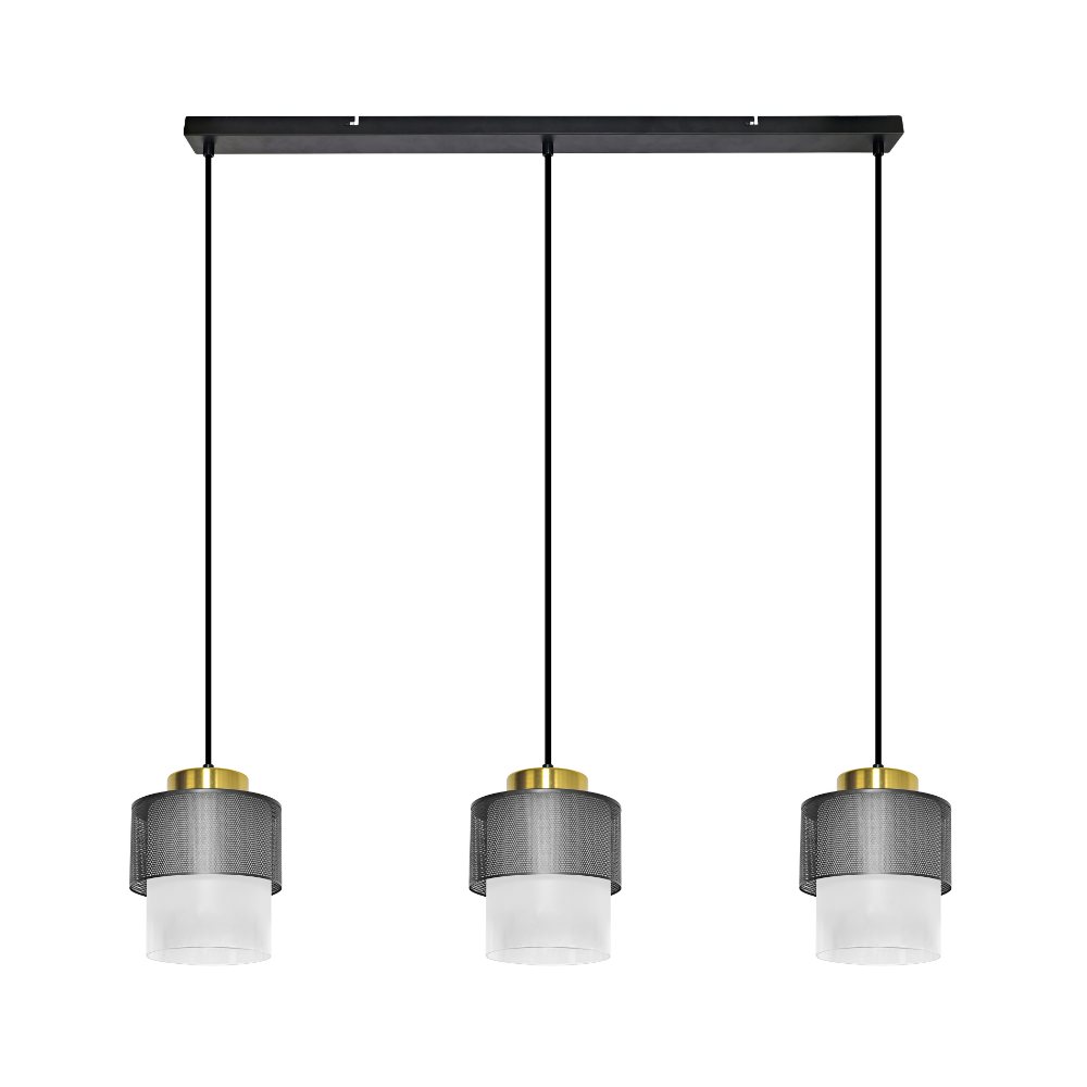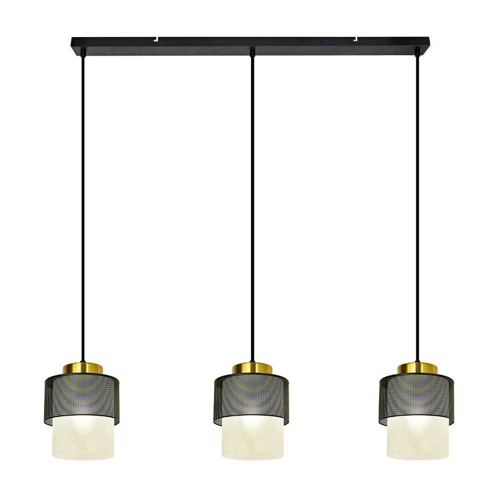 La lámpara de techo colgante Gifu lineal 3xE27 combina metal negro, detalles dorados y difusores de vidrio para ofrecer una iluminación moderna ideal para comedores y cocinas.