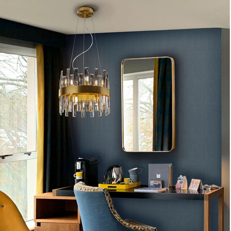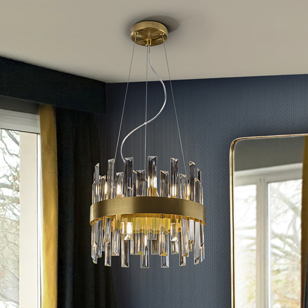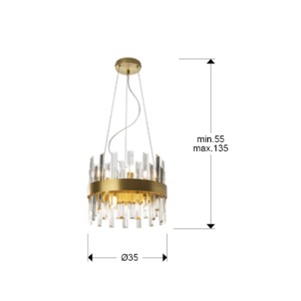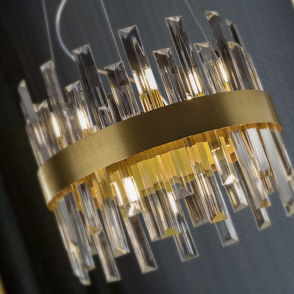 La lámpara de techo colgante Grace 10 L es una luminaria de diseño suntuoso y sofisticado, ideal para proyectar una iluminación decorativa y funcional en espacios amplios como salones, comedores, cocinas abiertas o zonas de estar. Su estructura circular está fabricada en metal con acabado oro cepillado, aportando un toque de lujo y calidez estética que se integra perfectamente en interiores modernos, clásicos o de estilo Art Decó. Esta lámpara cuenta con 10 puntos de luz G9 con bombillas LED incluidas de 4 W cada una, que ofrecen un flujo luminoso total de aproximadamente 4 000 lm, proporcionando una iluminación potente y armoniosa con luz cálida (3 000 K). El difusor está compuesto por barras de cristal transparente en forma de prisma, que no solo distribuyen la luz de manera uniforme sino que también generan un efecto visual elegante y sofisticado que realza el carácter de cualquier estancia. Gracias a su diseño con altura regulable (mín. 55 cm – máx. 135 cm), la lámpara Grace se adapta fácilmente a techos de diferentes alturas y se convierte en el foco de atención tanto en hogares como en ambientes contract y comerciales. La combinación de metal dorado y cristal crea un equilibrio perfecto entre lujo, funcionalidad y estética contemporánea.