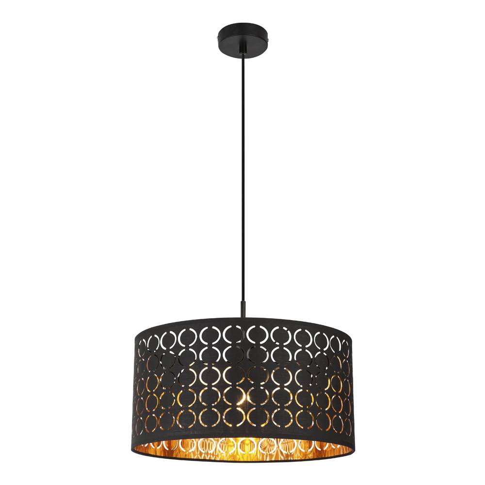 Lámpara colgante de estilo moderno modelo Harald. Su estructura es de metal acabado negro. Cable textil negro. Su pantalla de tela es de color negro e interior en acabado dorado, tiene unos perforados circulares por los que deja pasar la luz y le dan un toque original. Es compatible con bombilla led (no incluida). Su altura es regulable a la hora de la instalación. Harald es ideal para la iluminación de cualquier estancia, como por ejemplo, dormitorios, salones