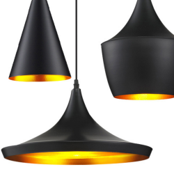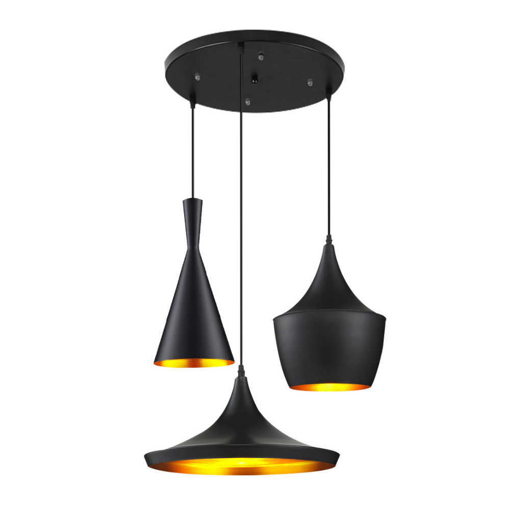 Lámpara colgante negra con interior dorado, diseño de 3 luces ajustables. Estilo moderno e industrial para cocina, comedor o barra.