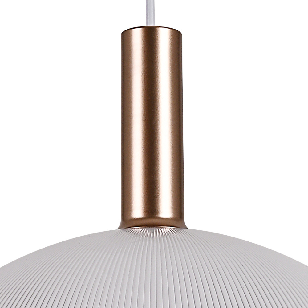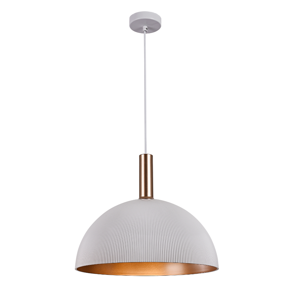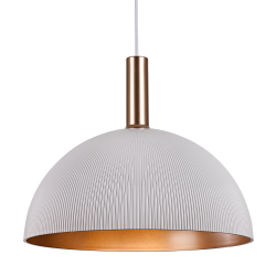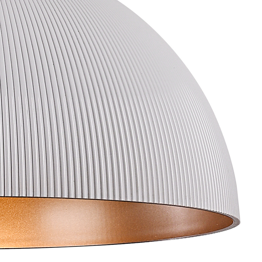 Lámpara de techo colgante KIEV con pantalla metálica blanca texturizada e interior cobre/dorado. Diseño moderno ideal para comedor, cocina o salón. Iluminación cálida y decorativa, perfecta para instalar sola o en composición sobre mesas o barras.