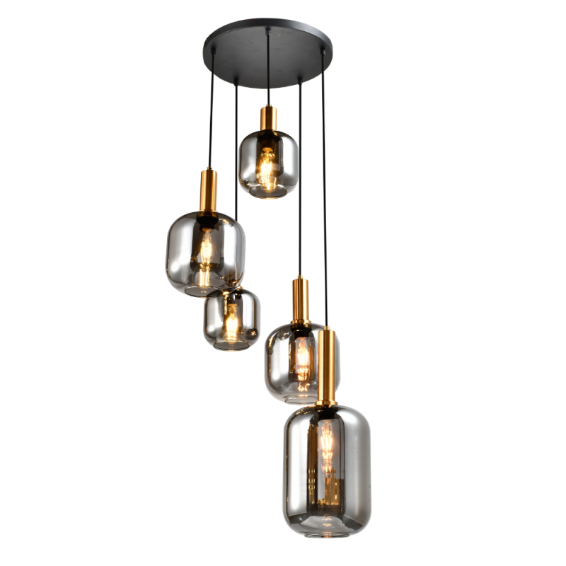 La colección Krumlov se compone de dos lámparas colgantes, una de ellas de 1 luz y la otra de 5 luces. Son perfectas para combinar en entre ellas en diferentes estancias. Tienen un diseño industrial moderno con detalles muy elegantes. La lámpara de techo colgante Krumlov 5L está realizada en metal acabado dorado mate y florón de sujeción al techo en acabado negro mate. Sus tulipas con forma cilíndrica son de cristal ahumado con efecto cromado. Este tipo de vidrio añade profundidad visual y permite que las bombillas sean parcialmente visibles, resaltando el estilo industrial. Krumlov es compatible con bombillas LED (no incluidas), os recomendamos utilizar una bombilla tipo filamento, cuyo estilo vintage complemente el diseño y aporte una iluminación cálida y suave. Su altura sus tulipas son regulables a la hora de la instalación para poder adaptarla al espacio que necesitemos. Es perfecta para utilizar en la iluminación de: un comedor, una sala de estar, recibidores, vestíbulos …