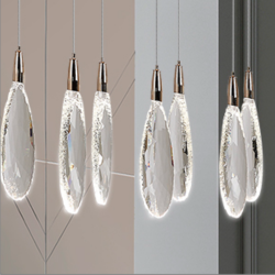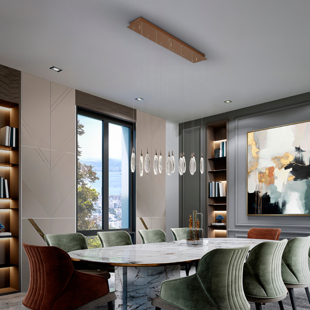 Lámpara colgante Schuller Lágrimas LED 12 L con acabado oro rosa, 12 luces LED integradas (24 W, 2400 lm) y lágrimas de cristal tallado. Luz regular en intensidad y temperatura (2700–6000 K) con mando a distancia y altura ajustable — ideal para comedores, salones o espacios modernos y elegantes.