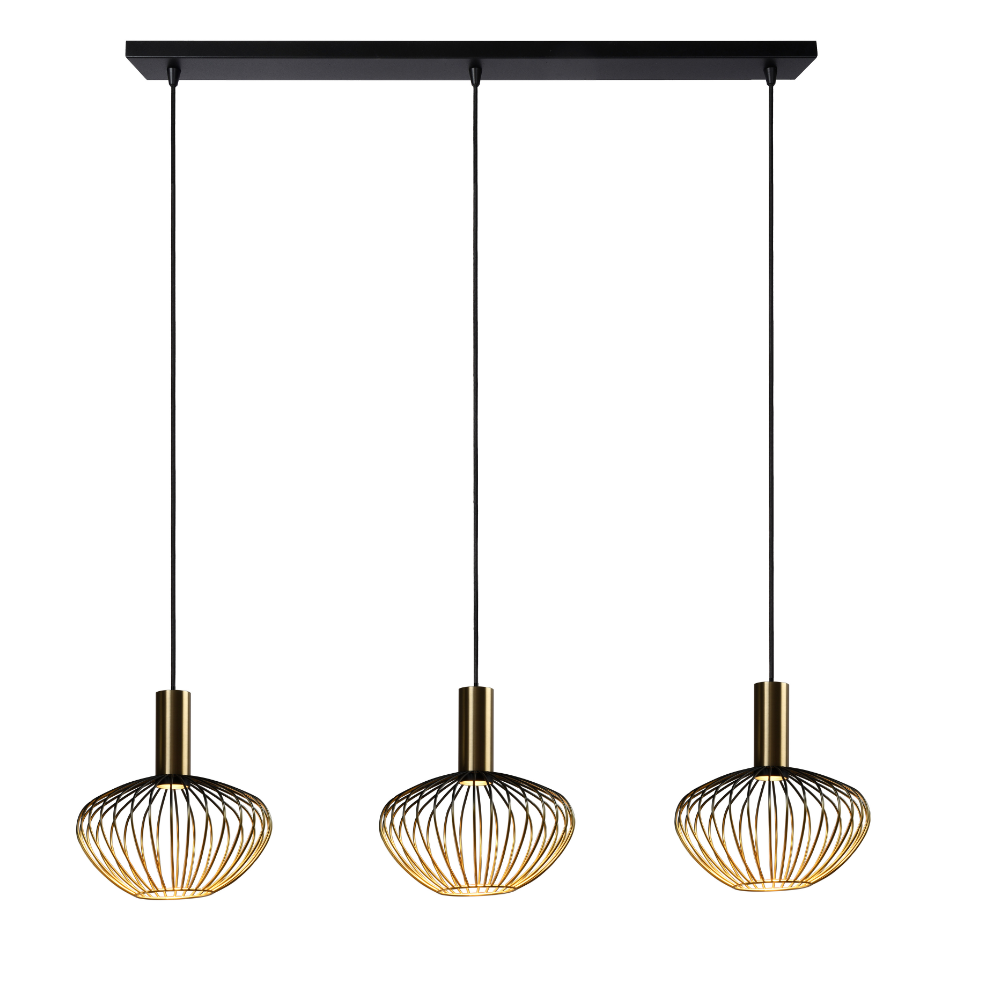 Lámpara colgante triple Liora Lineal estilo jaula dorada, diseño moderno, ideal para comedor, cocina o barra. Soporte negro y altura ajustable.