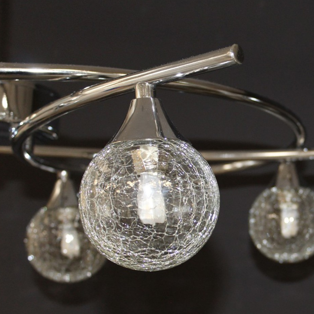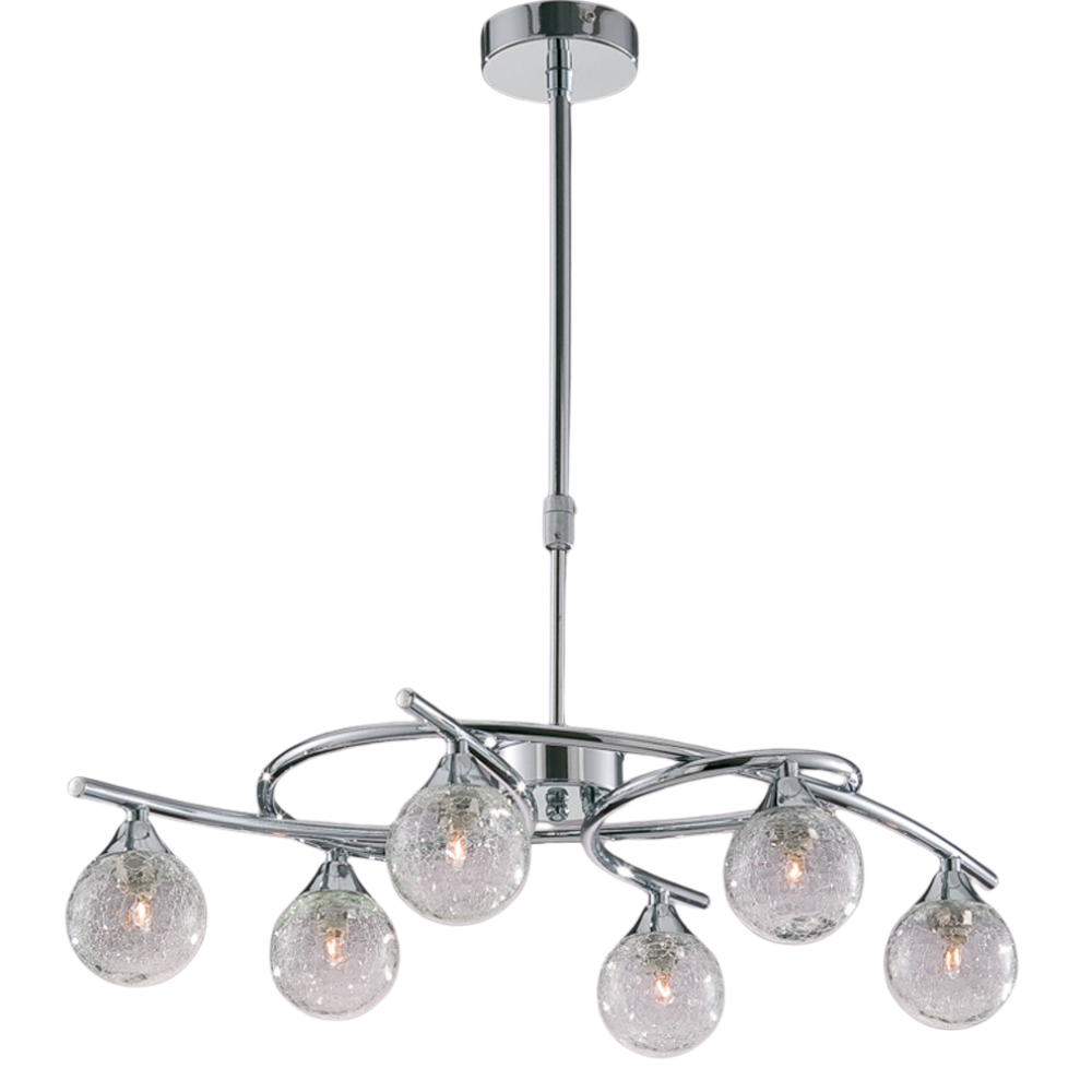 Lámpara de techo telescópica LOTTO CristalRecord 6 luces cromo con tulipas esféricas de cristal transparente. 6xG9 (sin bombillas), compatible LED. Medidas 735×450 mm y altura regulable 510–780 mm.