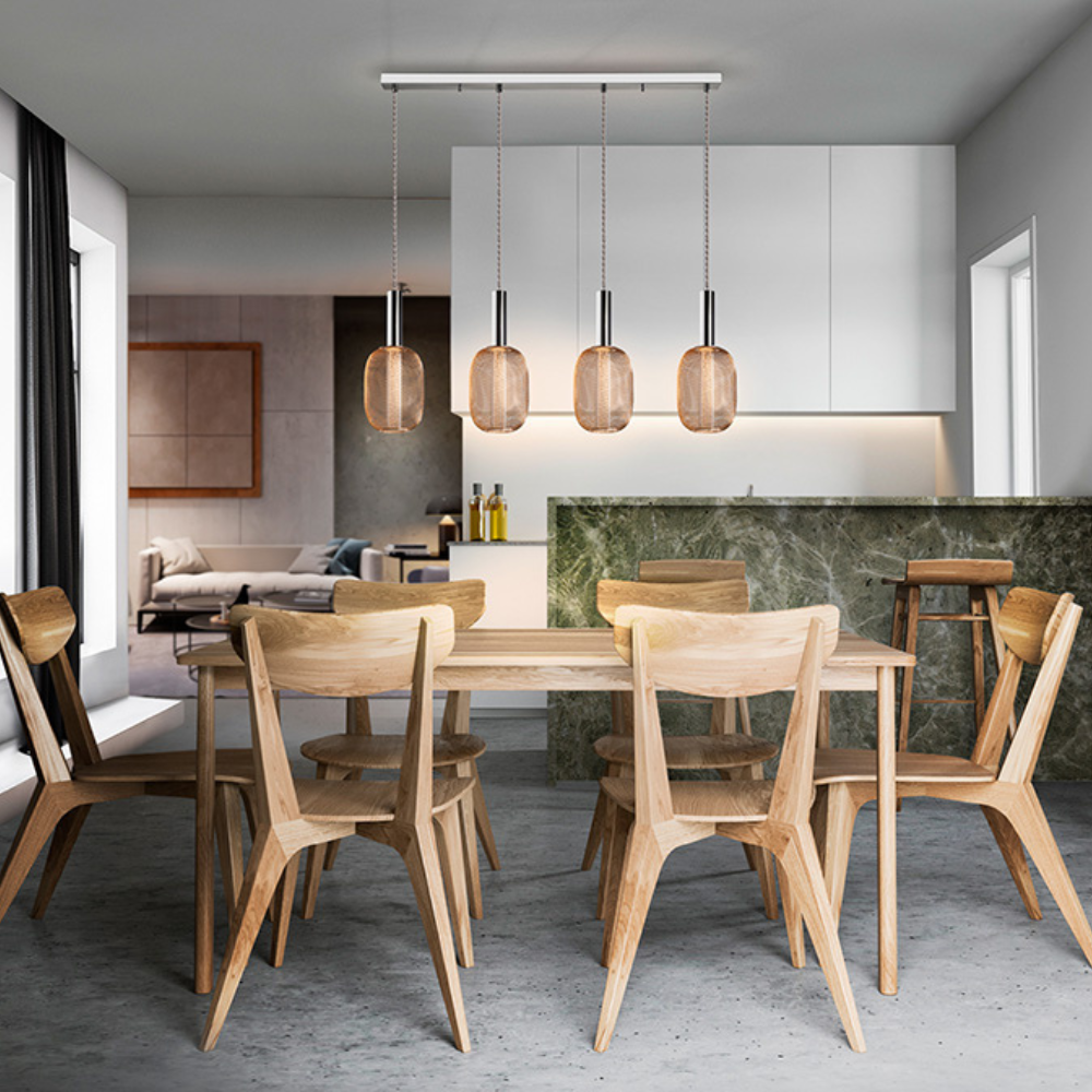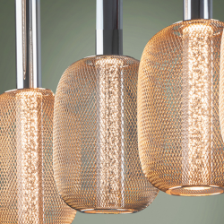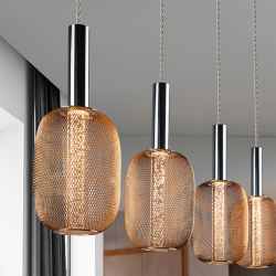 La lámpara de techo colgante Micrón de Schuller es una colgante lineal de estética contemporánea pensada para aportar un punto focal elegante sobre mesas de comedor, islas o barras. Está realizada en metal cromado y destaca por su original doble tulipa: un cilindro interior de acrílico transparente con burbujas que aporta textura y profundidad, y un óvalo exterior de malla metálica en oro brillo que crea un efecto decorativo sofisticado tanto encendida como apagada. Integra LED de 20W con 1.800 lm y 3000K (luz cálida), ideal para generar un ambiente acogedor con una iluminación eficiente. Además, es regulable (dimmable) mediante un regulador LED de pared específico para LED (no incluido), lo que permite adaptar la intensidad a cada momento (cena, ambiente, sobremesa). Por tamaño y proporción, se adapta muy bien a mesas rectangulares: 88 × 30 × 13 cm, con altura instalada regulable de 45 a 145 cm y un peso de 3 kg. Está indicada para interior (IP20). Micrón esta disponible en diferentes formatos.