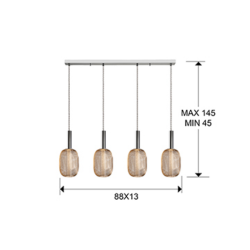 Lámpara de techo Schuller Micrón colgante lineal de metal cromado con doble tulipa (acrílico transparente con burbujas + malla metálica oro brillo). LED 20W, 1800 lm, 3000K, dimmable con regulador LED de pared. Medidas 88×30×13 cm, altura regulable 45–145 cm, IP20