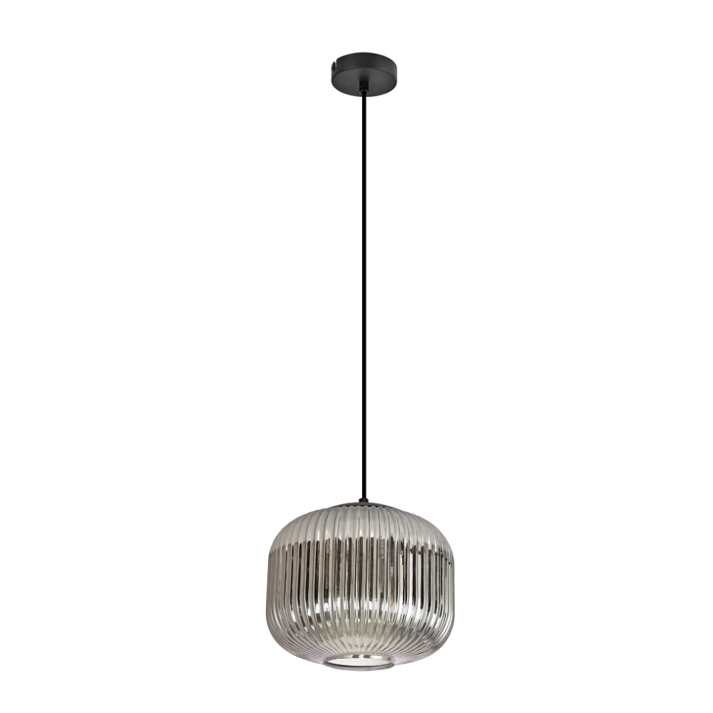 La lámpara de techo colgante modelo Nara destaca por su elegante diseño contemporáneo y su acabado en cristal acanalado que aporta textura, brillo y una iluminación cálida al espacio. Su pantalla de vidrio estriado crea un atractivo efecto visual al encenderse, distribuyendo la luz de forma suave y decorativa, ideal para crear ambientes acogedores en salones, comedores, dormitorios o espacios comerciales. El diseño minimalista de esta lámpara colgante combina perfectamente con estilos decorativos modernos, nórdicos, industriales o vintage. Su estructura superior en acabado negro y el cable suspendido aportan un contraste elegante con la transparencia del cristal ahumado, convirtiéndola en una pieza decorativa funcional y sofisticada. La lámpara Nara utiliza una bombilla LED E27 (no incluida), lo que permite elegir entre diferentes tipos de iluminación, como bombillas LED de filamento para potenciar su estética decorativa o luz cálida para generar una atmósfera confortable. Gracias a su diseño versátil y a la calidad de sus materiales, esta lámpara colgante es perfecta para instalar sobre mesas de comedor, barras de cocina, recibidores o zonas de paso, aportando estilo y personalidad a cualquier ambiente. Su altura es regulable a la hora de la instalación. Disponible en otros formatos y acabado ámbar.