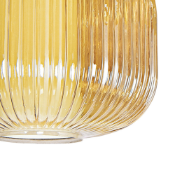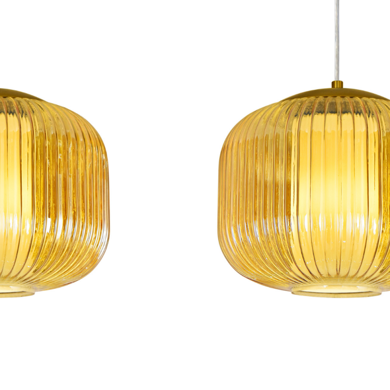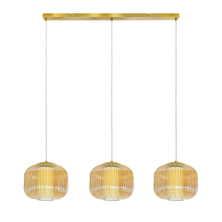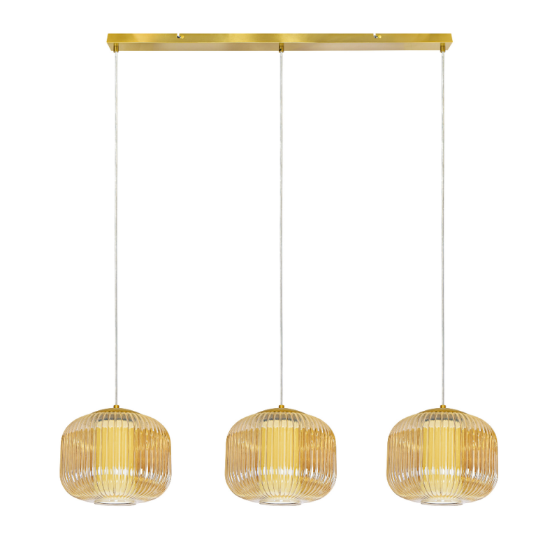 Lámpara colgante NARA Lineal de 3 luces con estructura dorada y pantallas de cristal estriado ámbar. Ideal para comedor, isla de cocina o barra. Compatible con bombillas LED (no incluidas).