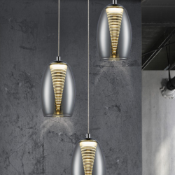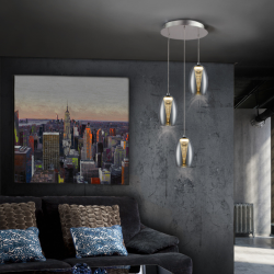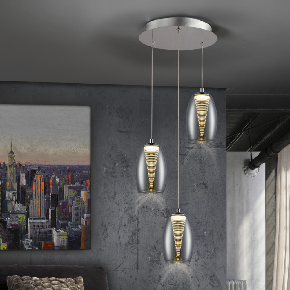 Lámpara colgante Schuller Nebula de 3 luces LED en cromo con doble tulipa: cristal espejado exterior y policarbonato transparente interior. 3×5W LED, 1350 lm, 3000K, no regulable.