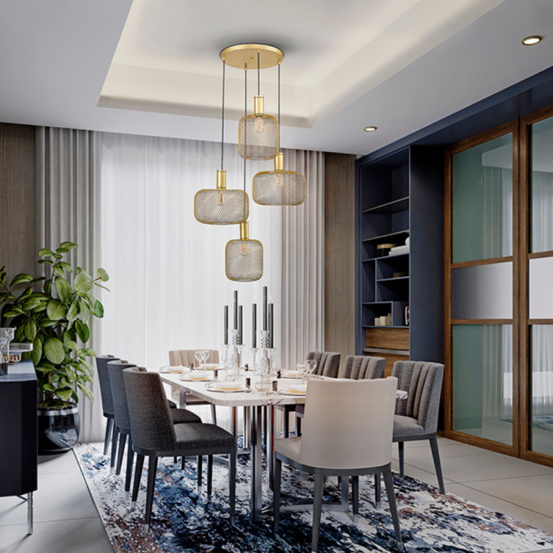 La lámpara de techo colgante Osiris de Schuller es una pieza decorativa de estilo moderno, perfecta para aportar un toque sofisticado a salones, comedores o recibidores. Está fabricada en metal con acabado dorado e incorpora 4 puntos de luz, acompañados por dos diseños de pantallas de rejilla metálica que crean un efecto visual muy atractivo y ayudan a proyectar la luz con un matiz decorativo. El conjunto se completa con cable textil negro, que refuerza su estética contemporánea. Incluye 4 bombillas LED E27 de 8W y es regulable (dimmable), para adaptar la intensidad según el ambiente: desde una iluminación más suave para crear atmósfera hasta una luz más intensa para el día a día (regulador no incluido). Ofrece un total de 3.480 lm con luz cálida 2700K (870 lm por bombilla), ideal para espacios acogedores. Su formato y proporciones la hacen muy versátil para colocar sobre mesas o zonas centrales: Ø58 cm y 120 cm de alto, con altura instalada regulable de 100 cm hasta 150 cm máximo a la hora de la instalación. Disponible en otros formatos y acabado negro.