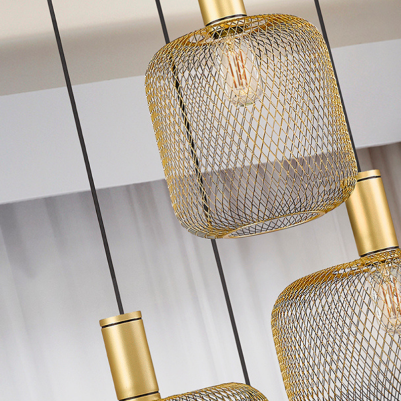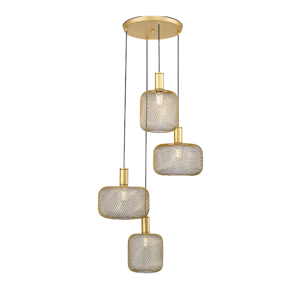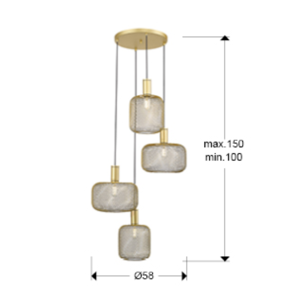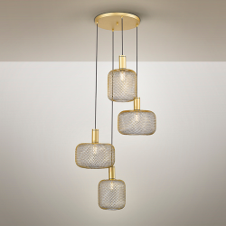 Lámpara colgante Schuller Osiris redonda 4 luces en metal dorado con pantallas de rejilla metálica (2 diseños) y cable textil negro. Incluye 4x LED E27 8W regulables, 3480 lm y 2700K. Medidas Ø58×120 cm, altura regulable 100–150 cm, IP20.