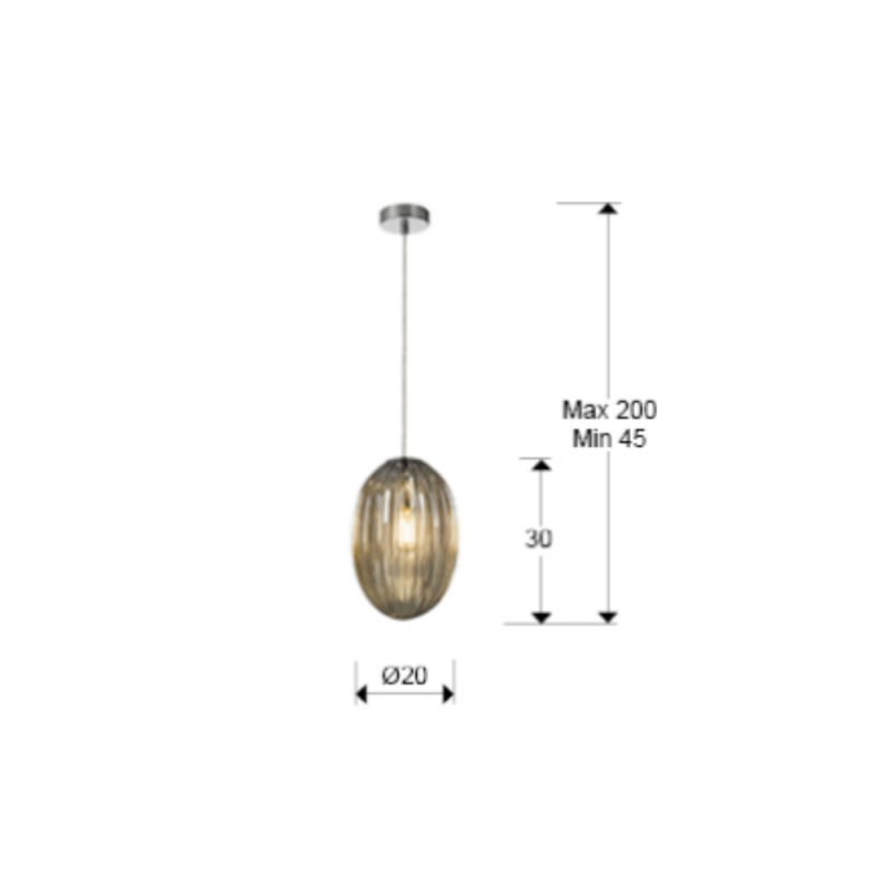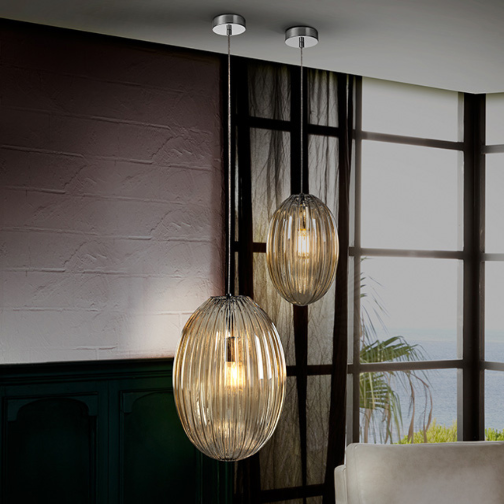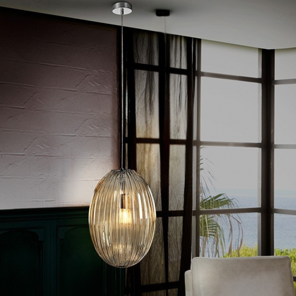 Lámpara colgante Schuller Ovilia en cromo con tulipa de cristal color coñac. 1xE27 con LED 8W incluido, regulable, 870 lm. Altura regulable 45–200 cm. Medidas Ø20×31 cm (tulipa Ø20×30 cm), IP20, Clase I. Incluye tacos de vuelco con balancín.