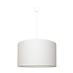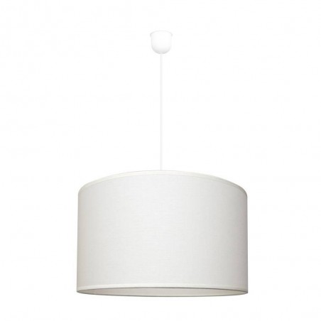 Lámpara colgante modelo Pantalla. Es una tipo de lámpara sencillo que se puede utilizar para iluminar cualquier estancia como por ejemplo, un salón, un dormitorio Su sujeción es de plástico blanco y su tulipa con forma cilíndrica es de tela en acabado beige. La medida de su pantalla es de 35cm Ø y 21cm de alto. Su altura es regulable a la hora de la instalación. Compatible con bombillas led (no incluida), os aconsejamos utilizar bombillas led de formato globo. Disponible en otros acabados y en versión sobremesa.