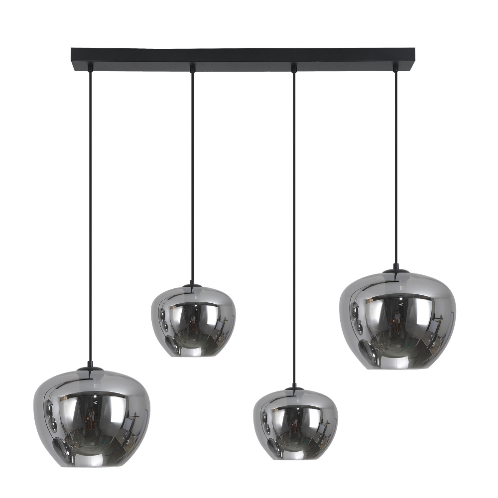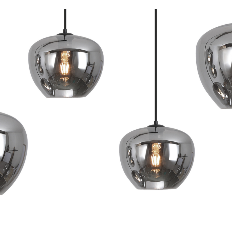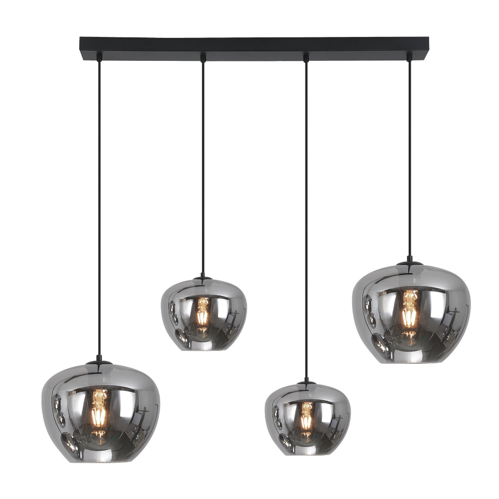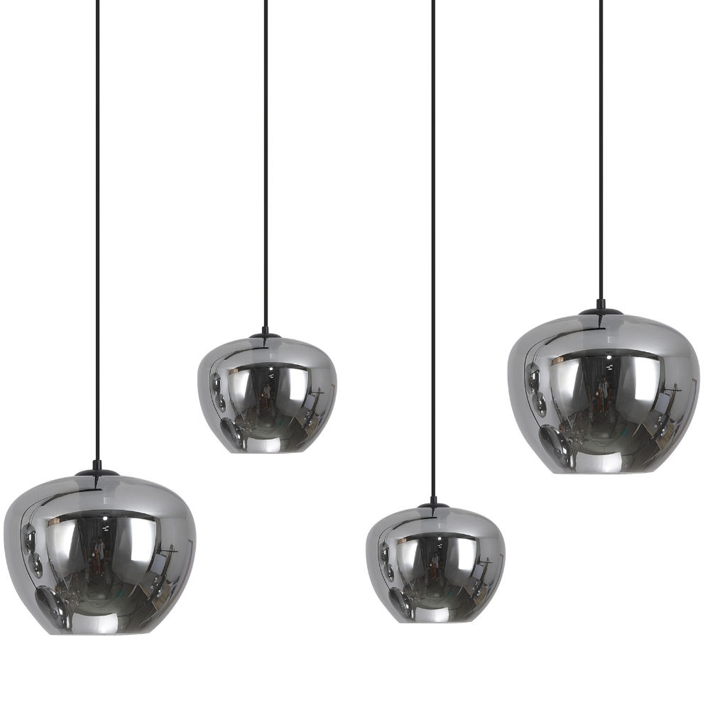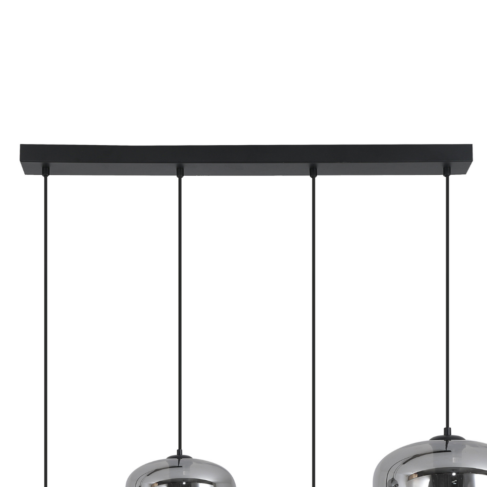 Lámpara de techo colgante Ribadeo lineal 4xE27 negra con tulipas de cristal ahumado efecto espejo, diseño moderno para comedor o cocina.