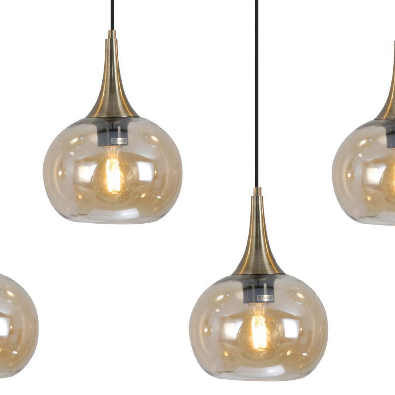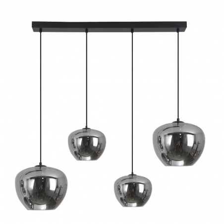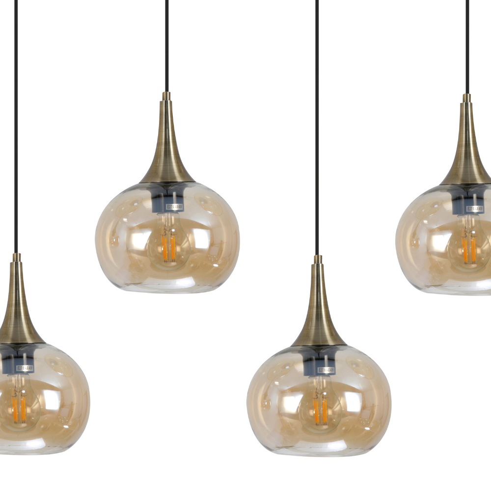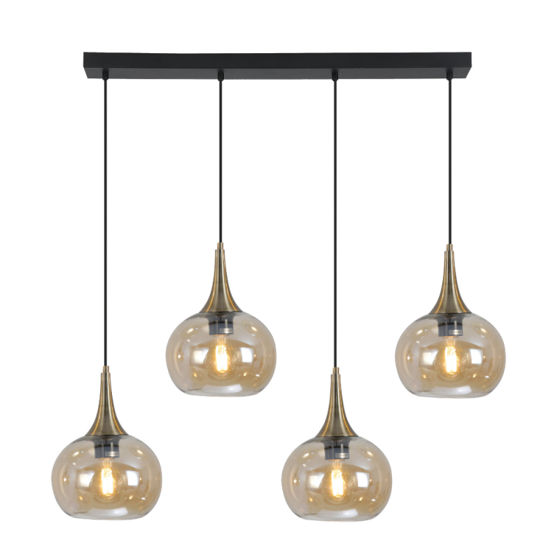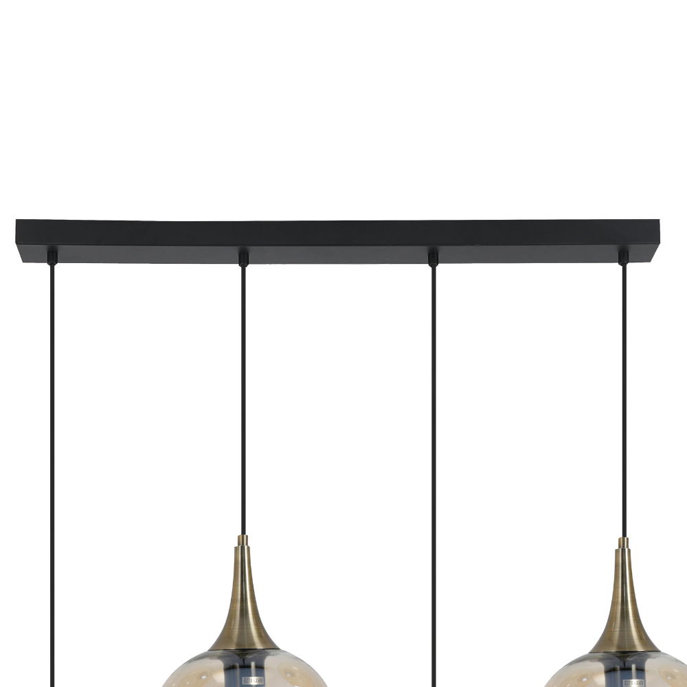 Lámpara de techo colgante lineal Ribadeo 4xE27 con acabado negro y tulipas de cristal efecto espejo ámbar. Diseño moderno vintage ideal para comedor, salón o cocina.
