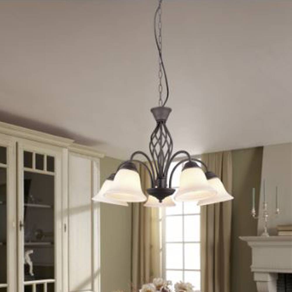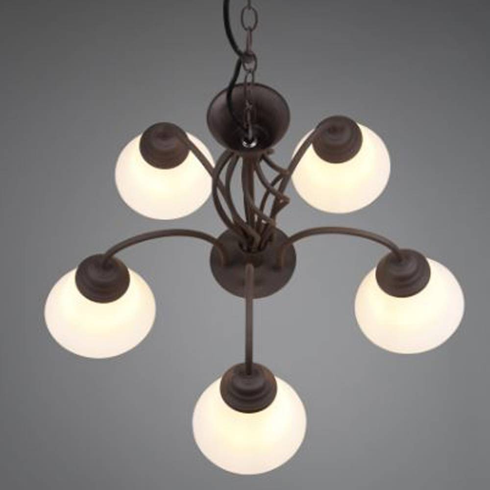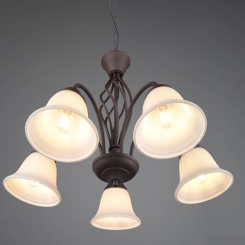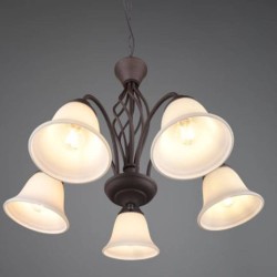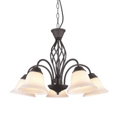 Lámpara colgante de la colección Rústica. Esta colección de lámparas es muy completa y su estilo es rústico. La lámpara colgante 5L Rústica está realizada en metal acabado óxido y sus tulipas son de cristal opal. Compatible con bombillas led (no incluidas). Altura regulable a la hora de la instalación. Tiene un diseño sencillo y se puede utilizar para iluminar dormitorios, salones o recibidores.
