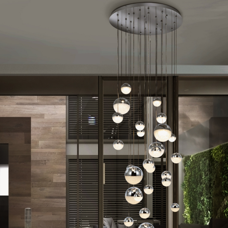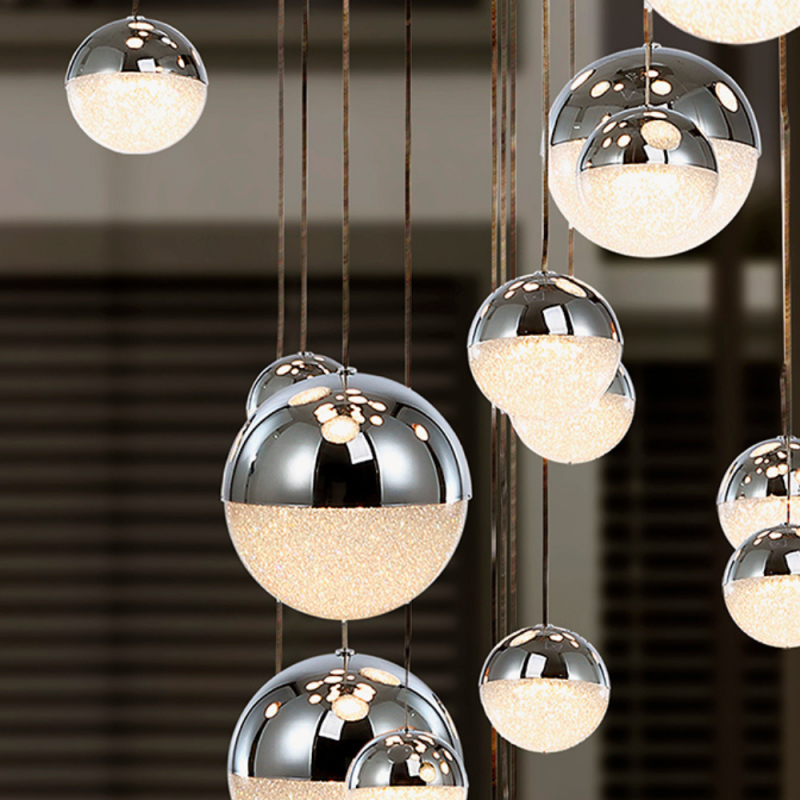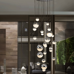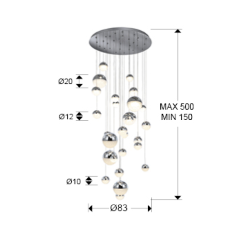 La lámpara de techo colgante Sphere 27 luces es una pieza de gran formato pensada para proyectos que buscan impacto visual y una iluminación potente. Está compuesta por 27 puntos de luz LED y una estructura de metal cromado, acompañada de pantallas/esferas de policarbonato (diámetros Ø10, Ø12 y Ø20 cm) con textura interior y detalles en cromo, creando un conjunto brillante y muy decorativo. Su tecnología LED integrada de 147,6W ofrece un flujo luminoso de 10.330 lm, ideal para estancias amplias o espacios contract. Incorpora sistema CCT regulable para ajustar la temperatura de color entre 3000K y 4000K, adaptando la atmósfera desde una luz cálida y acogedora hasta una más neutra y funcional. La regulación se realiza mediante Bluetooth con app en smartphone/tablet; además, puede integrarse con Google Home o Amazon Echo añadiendo un Bluetooth Gateway (no es compatible con regulador de pared). Destaca también por su versatilidad estética: permite ajustar la longitud de los cables y configurar distintas composiciones, con una caída de instalación 150 cm (hasta 500 cm máximo) a la hora de la instalación. Sus dimensiones aproximadas son Ø83 cm y altura total 260 cm, con un peso de 23,9 kg; incluye gravity toggles para una fijación más segura, recomendándose un anclaje firme y una instalación cuidada. La colección Sphere es muy amplia y esta disponible en diferentes formatos y acabados.