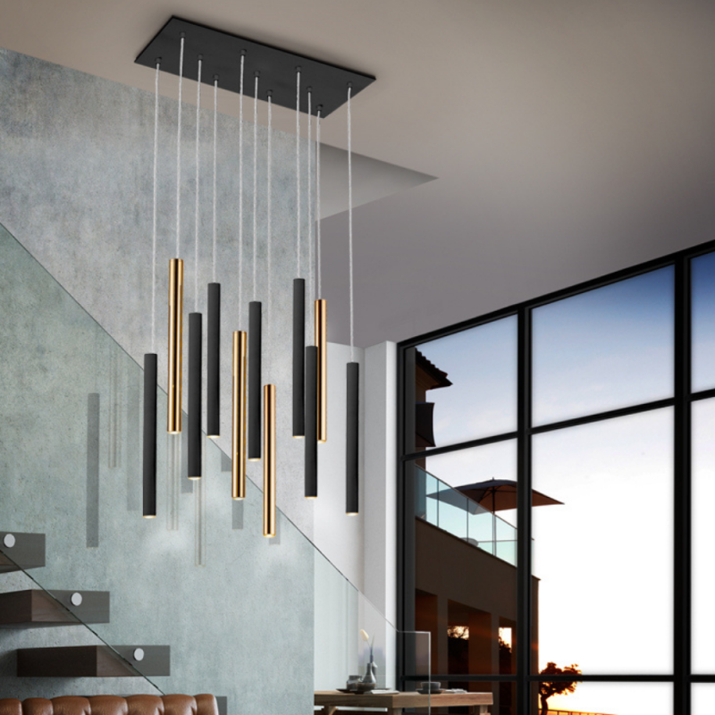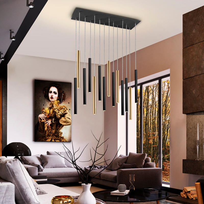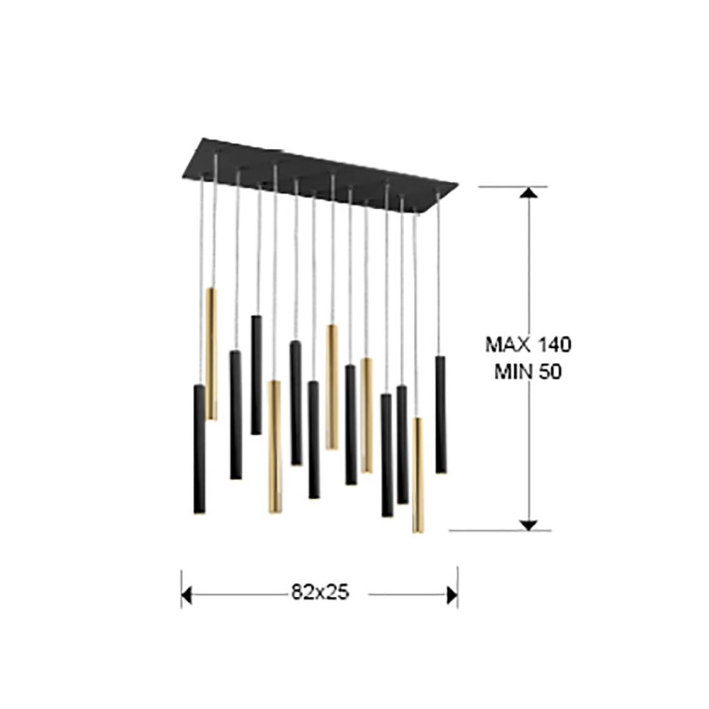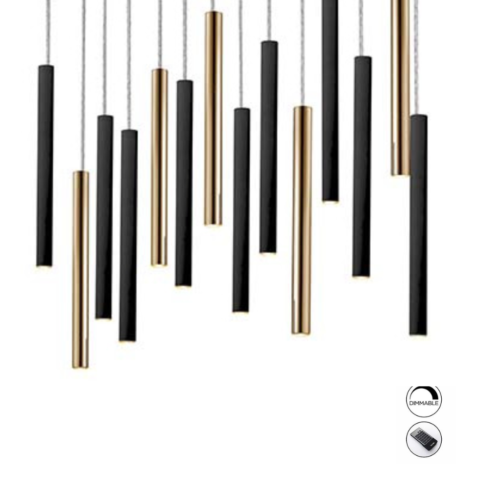 Lámpara colgante VARAS 14L LED 70W 3000K regulable en oro y negro con mando. Diseño moderno de 14 luces para espacios amplios.