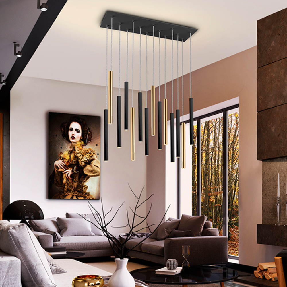 La lámpara colgante VARAS 14L DIMABLE de Schuller es una pieza de iluminación de gran impacto visual diseñada para espacios amplios que buscan protagonismo y elegancia. Su composición lineal con 14 puntos de luz LED suspendidos crea una estructura dinámica y escultural que transforma cualquier estancia en un ambiente sofisticado. Fabricada en metal con acabado oro brillo y negro mate, combina dos tonos en tendencia que aportan contraste, profundidad y un estilo contemporáneo de alto nivel. Los difusores de acrílico opal garantizan una distribución uniforme de la luz, evitando deslumbramientos y generando una iluminación suave y envolvente. Equipada con tecnología LED integrada de 70W, ofrece un flujo luminoso de 6.300 lúmenes y una temperatura de color de 3000K (luz cálida), ideal para crear ambientes acogedores sin perder potencia lumínica. Además, incorpora sistema DIMABLE con mando a distancia, permitiendo regular la intensidad de la luz según el momento o la actividad. Su altura es ajustable a la hora de lainstalación, lo que facilita su instalación en diferentes espacios como comedores, salones de gran tamaño o zonas de doble altura. Una luminaria pensada para quienes buscan diseño, potencia y control total de la iluminación en una sola pieza.