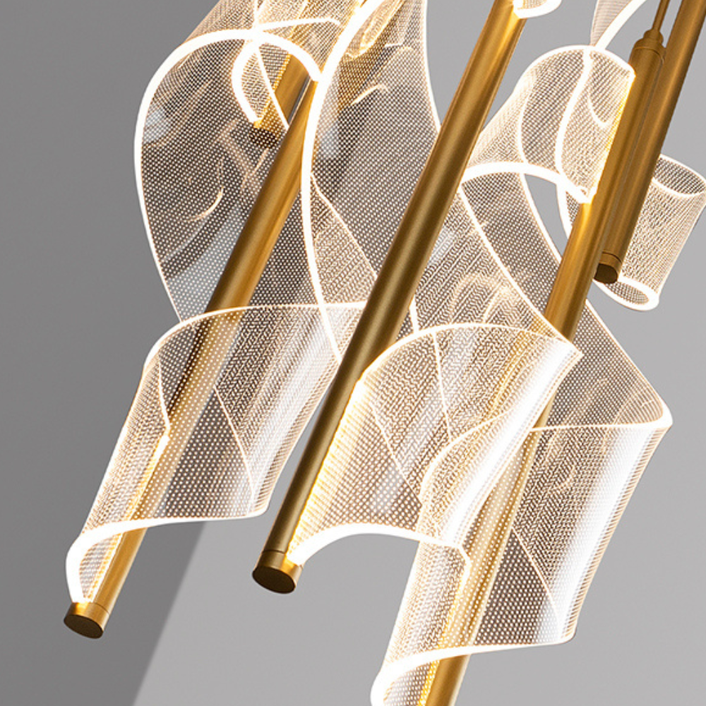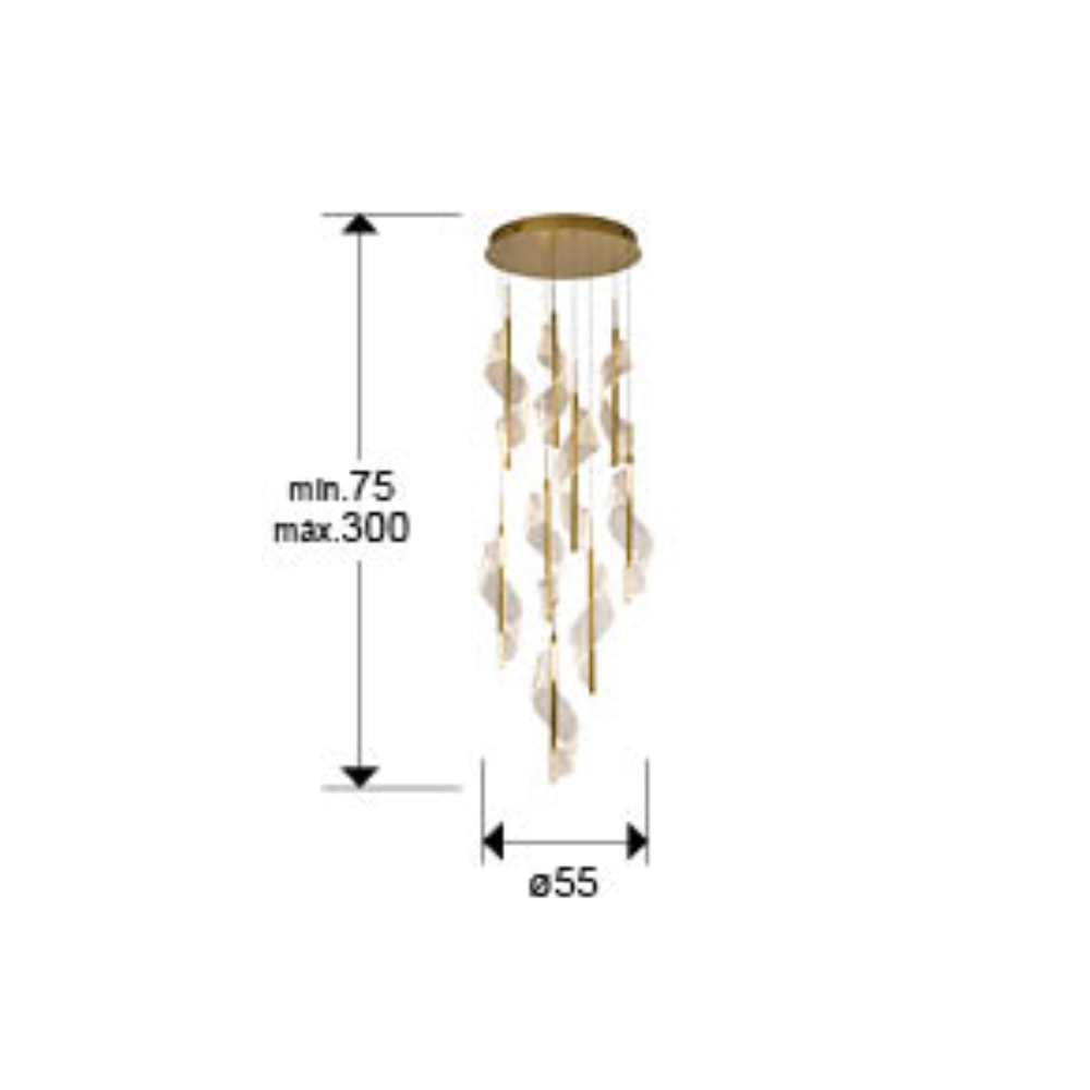 Lámpara colgante Velas (Schuller) en metal/aluminio oro mate con difusores de metacrilato microimpreso. LED 78W, 4.250 lm, 3000K, regulable con mando y APP TUYA. Medidas 55×57 cm y altura regulable 75–300 cm. IP20.