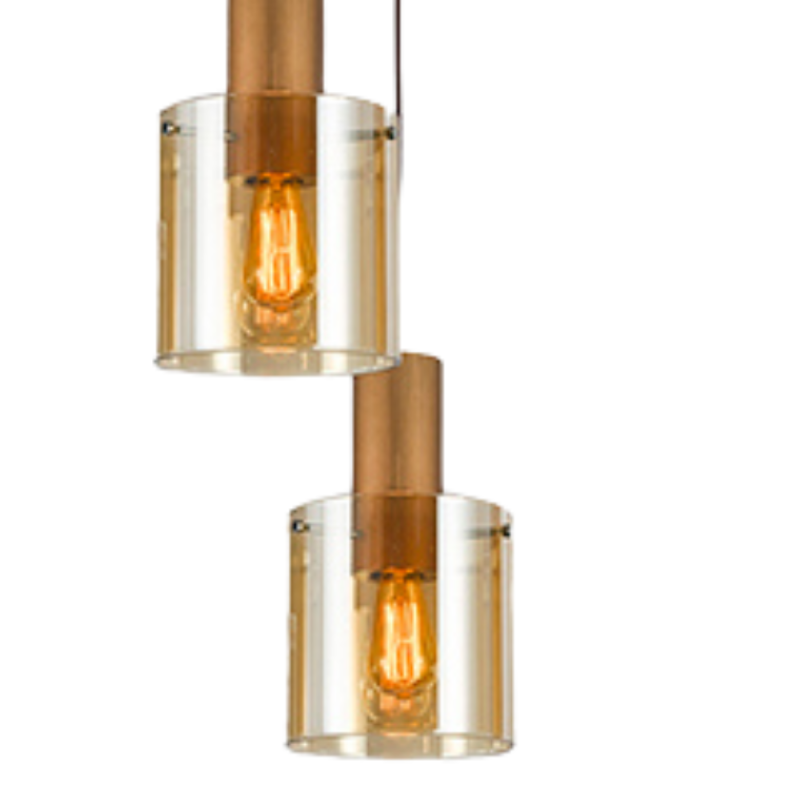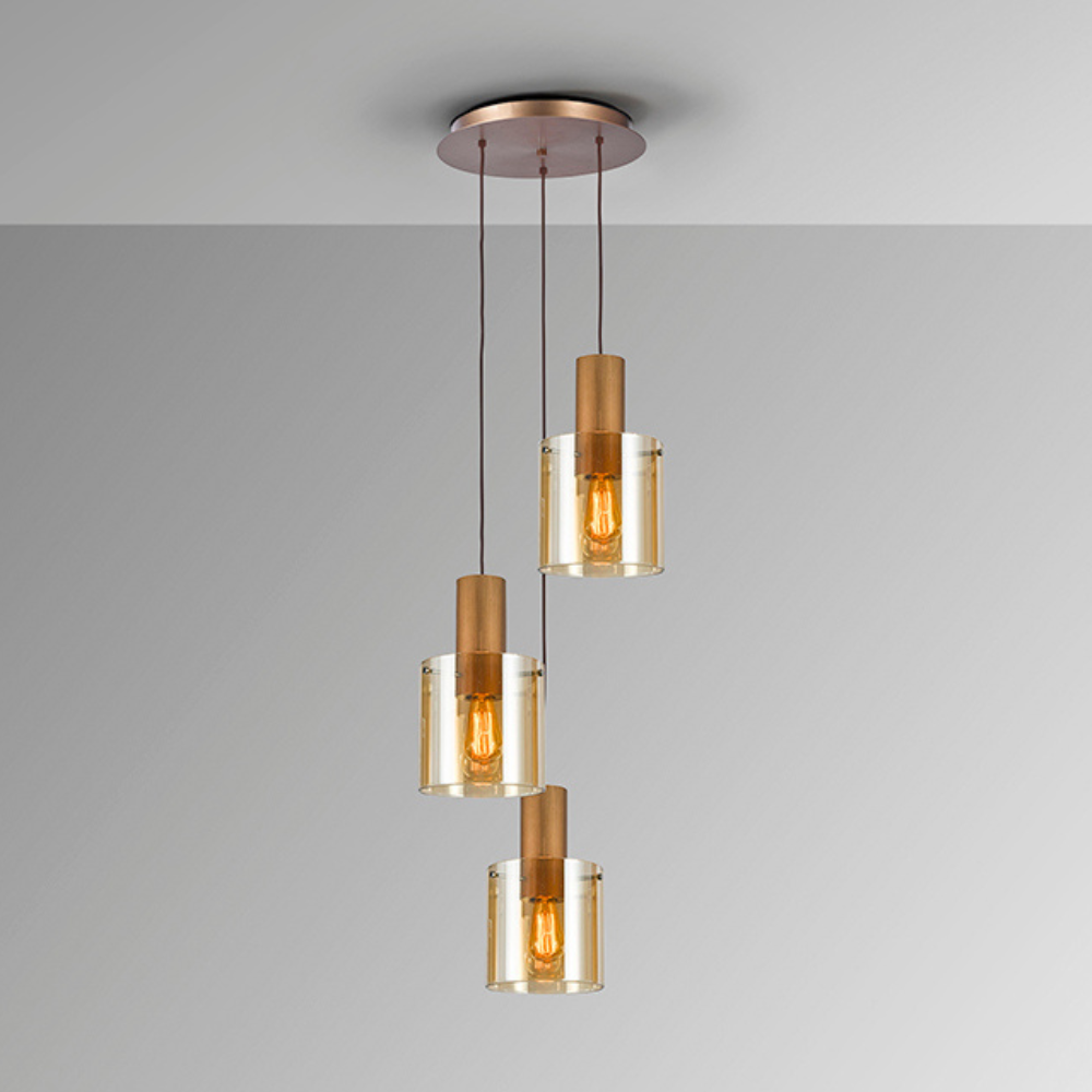 Lámpara de techo colgante Venize 3L con acabado cobre satinado y tulipas de cristal ámbar, estructura metálica, altura regulable y portalámparas E27 — iluminación cálida y decorativa ideal para salones, comedores y cocinas modernas.