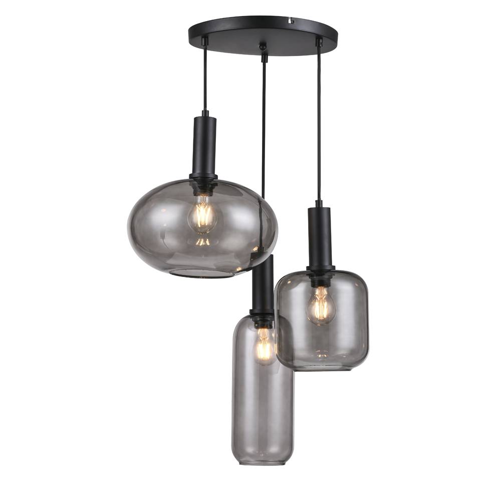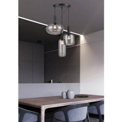 Lámpara de techo 3l fume. Su estructura es de metal acabado negro mate. Su cable es textil negro. Cada tulipa tiene una forma diferente, son de cristal acabado fume. Gracias a su diseño podremos regular la altura de cada una de ellas a la hora de la instalación. La lámpara de techo 3l fume es compatible con bombillas led (no incluidas), os recomendamos utilizar bombillas led de filamento visto. Existe modelo similar en colgante lineal y en 1l.