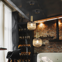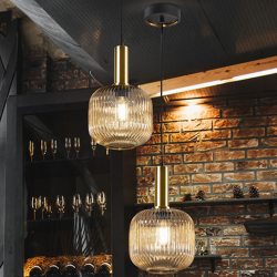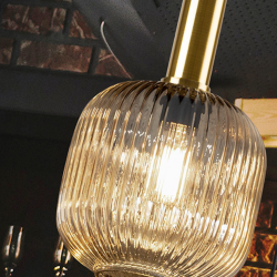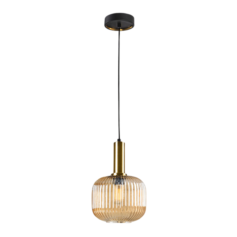 Lámpara colgante Schuller Norma con tulipa de cristal ámbar, metal negro mate y detalles en latón satinado. Incluye bombilla LED E27 de 8 W y altura regulable. Iluminación moderna y cálida ideal para salón, comedor o dormitorio