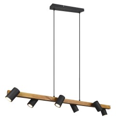 Lámpara colgante lineal 6 luces de la colección Marley. Su estructura y tulipas están realizadas en metal acabado negro y detalles en madera . La altura es regulable a la hora de la instalación. Focos basculantes, para poder orientar la luz hacia donde necesitemos. Compatible con bombillas led (no incluidas).La lámpara colgante Marley es ideal para instalar encima de una encimera o encima de una mesa de comedor. También es una buena opción si tienes un negocio y deseas iluminar una encimera, mesa. Disponible en diferentes acabados y diferentes versiones.