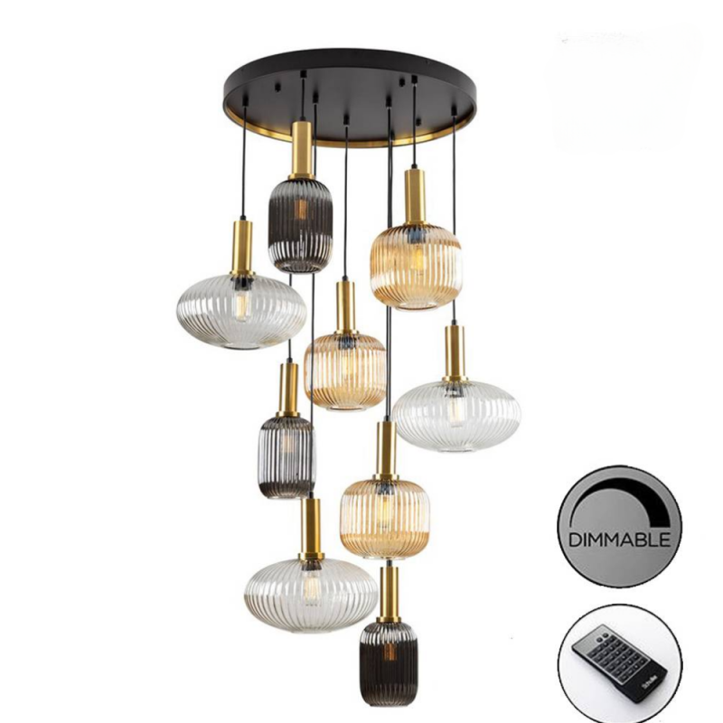 Lámpara colgante modelo Norma 9L Latón/ / Negro Dimmable. Su estructura es de metal acabado negro mate con detalles en latón satinado. Sus originales tulipas son de cristal moldeado de diferentes acabados: transparente, ámbar y gris ahumado (efecto espejo).La altura de cada una de sus tulipas es regulable a la hora de la instalación, altura mínima 110cm y altura máxima 320cm. Incluye bombillas led de 8w consumo (870lm) en tonalidad 2700k (luz cálida).Incluye mando a distancia y desde el podremos graduar la intensidad de su luz entre otra funciones. Disponible en diferentes formatos.