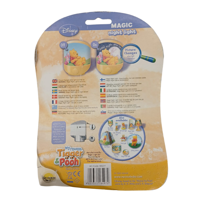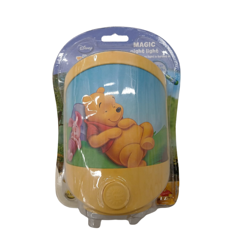 Dulce compañía para la hora de dormir. Esta luz nocturna de Winnie the Pooh cambia la ilustración al encenderse, creando un efecto “mágico” que tranquiliza y decora el dormitorio. Medidas: 14 × 14 × 6 cm (alto × ancho × fondo)Características Ilustración que cambia al encender la luz.LED de larga duración incluido: luz suave y de bajo consumo.Botón frontal de encendido/apagado.Funciona con 3 pilas AAA o adaptador DC 4,5 V (no incluidos).Carcasa ligera y segura, ideal para habitaciones infantiles y pasillos.Un detalle encantador para acompañar el sueño de los peques con su personaje favorito de Disney.