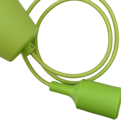 Suspensión sencilla y colorida para crear tu propia lámpara. Incluye florón de techo, portalámparas E27 en silicona verde y cable textil de 1 m.Datos claveCasquillo: E27 (rosca gorda)Cable: textil, 1 m de largo (ajustable) Material: silicona suave (florón y portalámparas)Uso interiorBombilla no incluidaIncluye tornillería/gancho para fijaciónIdeal para: colgar bombillas decorativas, pantallas ligeras o crear composiciones en cocinas, bares, dormitorios y zonas de lectura.
