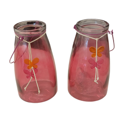 Jarrón de vidrio en color rosa y con detalles de mariposas .Retro iluminada por led en su interior. Ideal para decorar mesas de jardín. Pilas no incluidas.