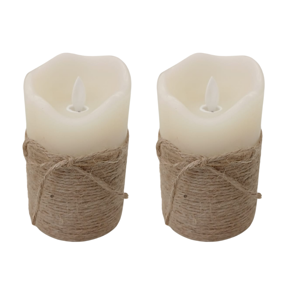 Pack de 2 velas LED de 8 cm de diámetro y 13 cm de alto, con acabado en cera y decoradas con cuerda rústica. Funcionan con 2 pilas AAA cada una (no incluidas). La llama oscilante y el LED cálido crean un efecto realista de vela encendida, seguro y sin humo.