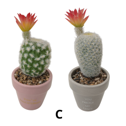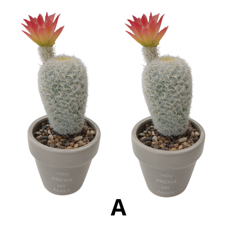 Pack de 2 macetas decorativas con cactus artificial, perfectas para dar un toque verde sin mantenimiento. Cada pieza incluye maceta de cerámica con mensaje y acabado brillante, rellena con gravilla decorativa y un cactus con flor en tonos rojos/naranjas.