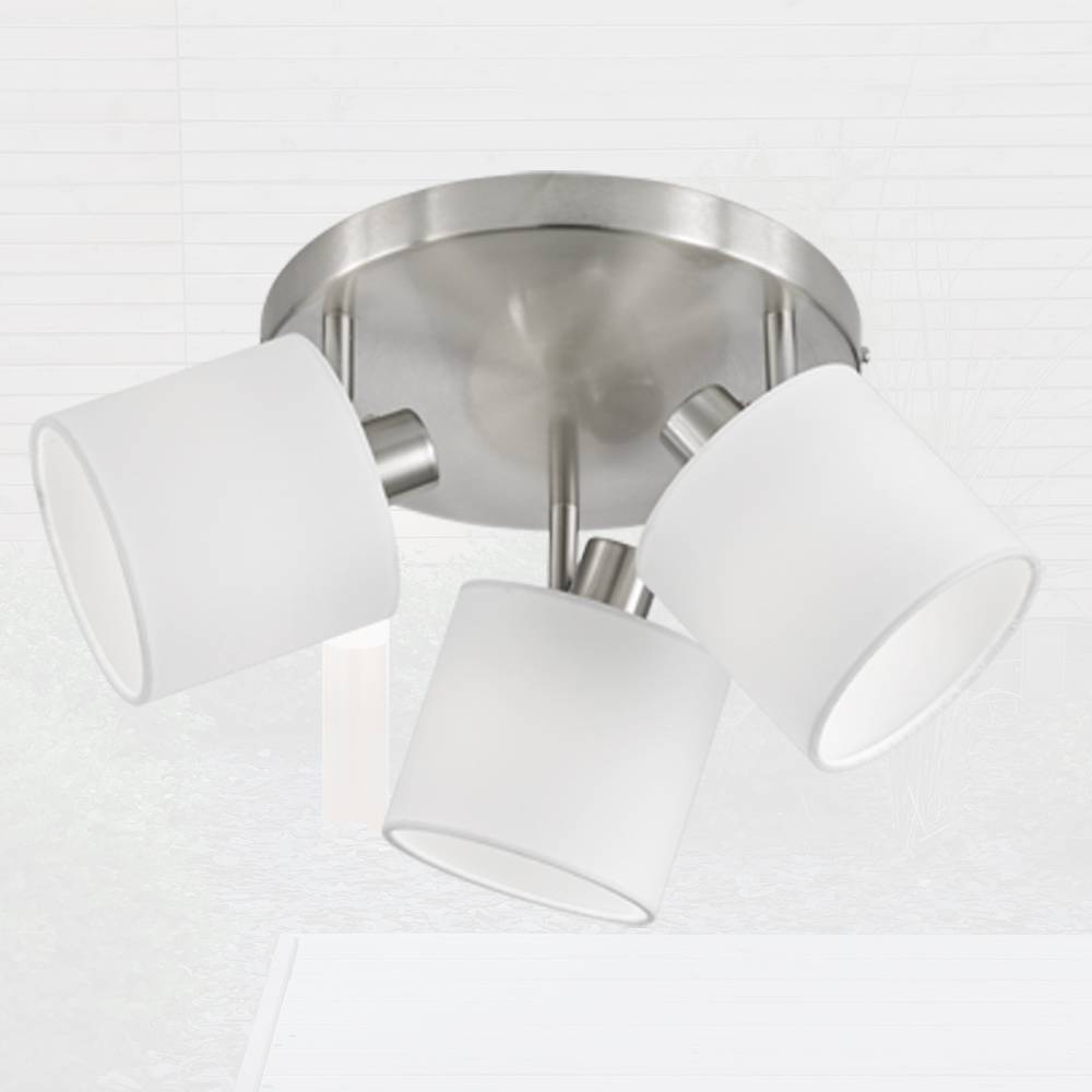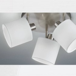 Plafón 3l Tommy. Su estructura es de metal en acabado níquel mate. Sus 3 tulipas con forma cilíndrica están realizadas en tela color blanco. Compatible con bombillas led (no incluidas). Gracias a su diseño sus cabezales son orientables y nos permite orientar el haz de luz hacia donde necesite. De estilo moderno, el plafón 3l Tommy se puede instalar en cualquier estancia, salón, dormitorios, vestidor La serie Tommy está disponible en diferentes formatos y en acabado negro.