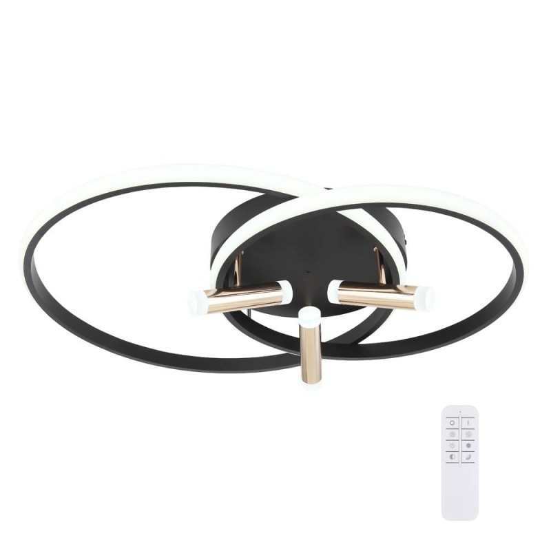 Plafón de techo modelo Coco. Su original estructura esta realizada en metal y aluminio acabado negro. Perfil en acrílico blanco y en su parte central 3 cilindros de aluminio en tono dorado brillo. Emite luz por todas las partes perfiladas de acrílico y también por los dos extremos de cada cilindro. Lleva integrada tecnología led de 55w consumo (2300lm). Incluye mando a distancia, desde él podremos elegir la tonalidad de luz que deseemos desde 2700k (luz cálida) hasta llegar a 6000k (luz fría) y algunas funciones más, como luz de posición, regulador de intensidad Coco es ideal para utilizar como iluminación en un salón o dormitorio.