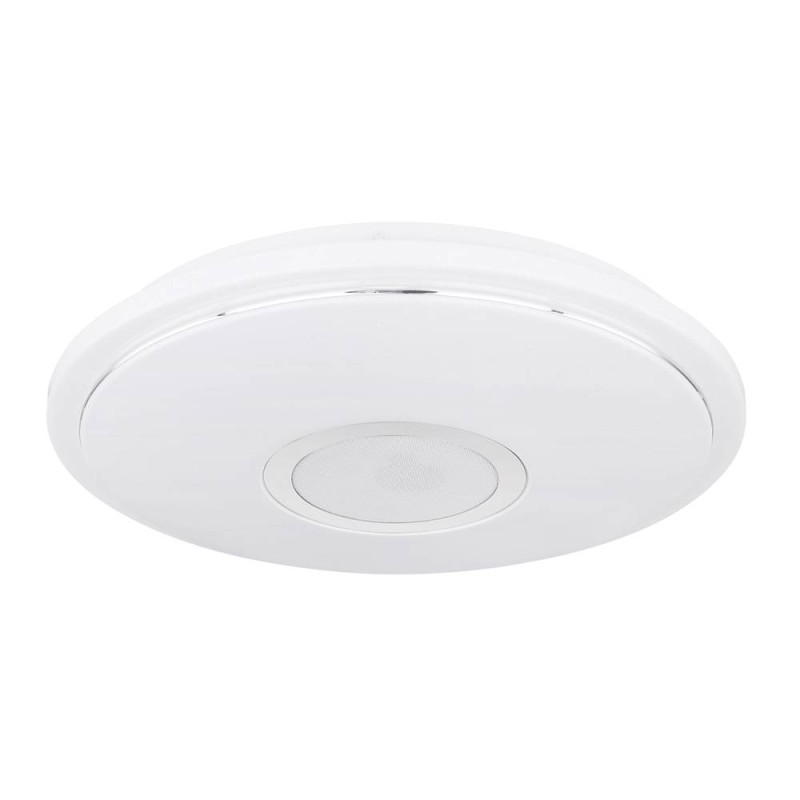 Plafón para techo de la colección Connor. Su estructura es de metal y su difusor está realizado en acrílico blanco (efecto estrellas) con detalles en metal cromado. Lleva integrado una placa led de 16w consumo (1040lm) y desde el interruptor de nuestra casa podremos elegir la tonalidad de luz que deseemos de las 3 opciones que nos ofrece 3000k (luz cálida) 4000k (luz neutra) 6000k (luz fría).En su centro, lleva integrado un altavoz de 3w consumo, él, podremos escuchar la música que más nos a través de Bluetooth. Disponible en un tamaño superior.