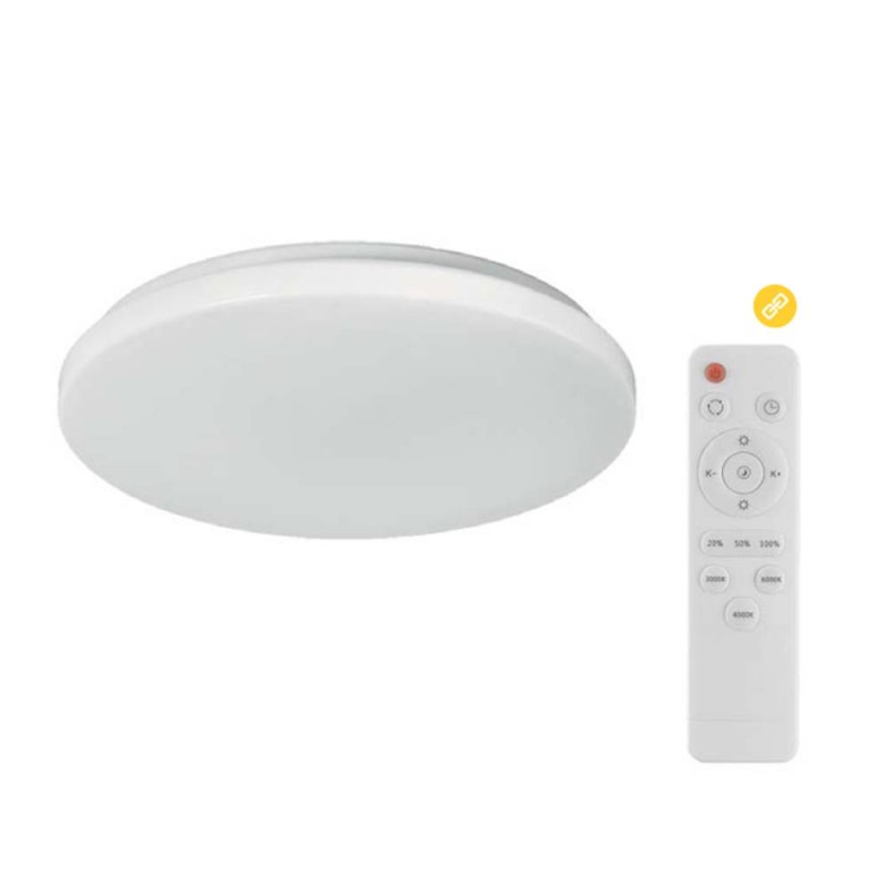 Plafón modelo Eros con base de metal y difusor de Pvc blanco opal. Lleva integrado una placa de led con 48w consumo ( 4000lm) y su tonalidad oscilante desde 3000k (luz cálida) a 6000k (luz fría). Es un plafón sencillo y muy versátil ya que se puede utilizar para iluminar cualquier estancia como por ejemplo dormitorios, salones, etc. Incluye mando a distancia (pilas no incluidas) con varias funciones, entre ellas, regulación de color, intensidad, temporizador Es extrafino y eso hace que sea la opción perfecta para estancias con techos bajos.