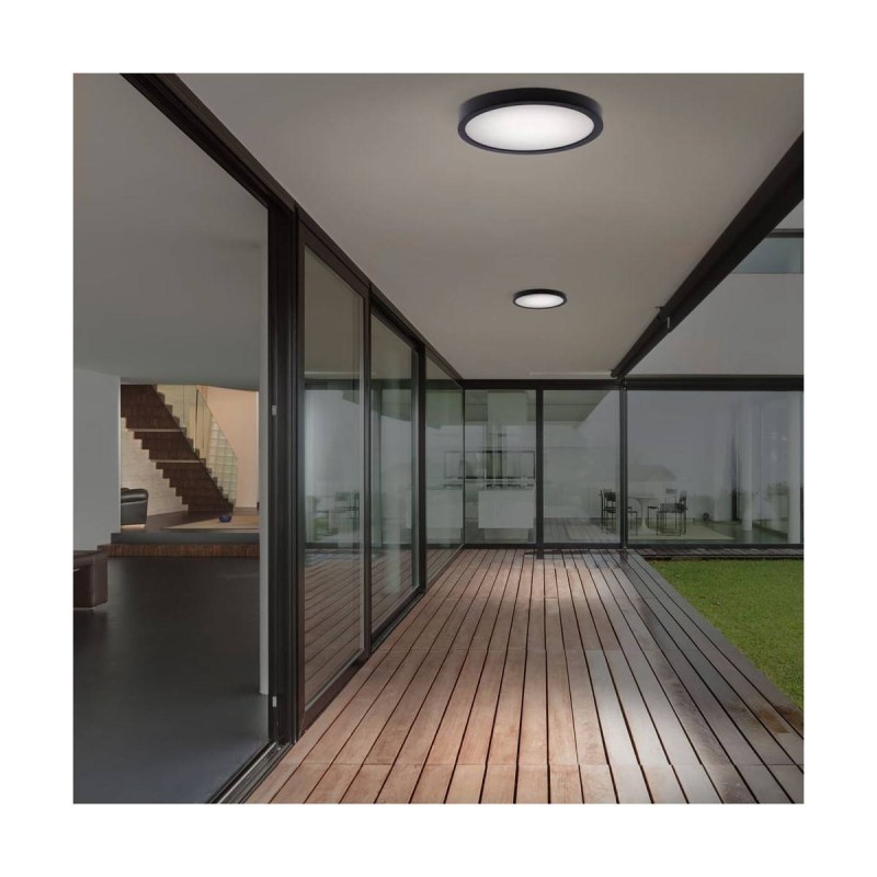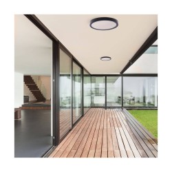 Plafón de superficie Gelys. Su estructura es de aluminio en gris antracita y difusor en acrílico blanco. Lleva integrada una placa led de 30w consumo (2700lm) en tonalidad 4000k (luz neutra). Fácil de instalar en techo o en pared. Gelys es ideal para instalar es espacios húmedos como por ejemplo en un porche, balcón e incluso en baños y aseos. Disponible en una potencia y tamaño inferior o en acabado blanco.