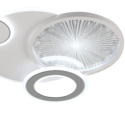 Los plafones de la colección Machala son originales y modernos, con estructura blanca y detalles cromados, ofreciendo luz indirecta y ajustable (3000K a 6000K) con un mando a distancia. Tienen un consumo de 72W y 5040 lúmenes de potencia, ideales para estilos modernos y decorativos.