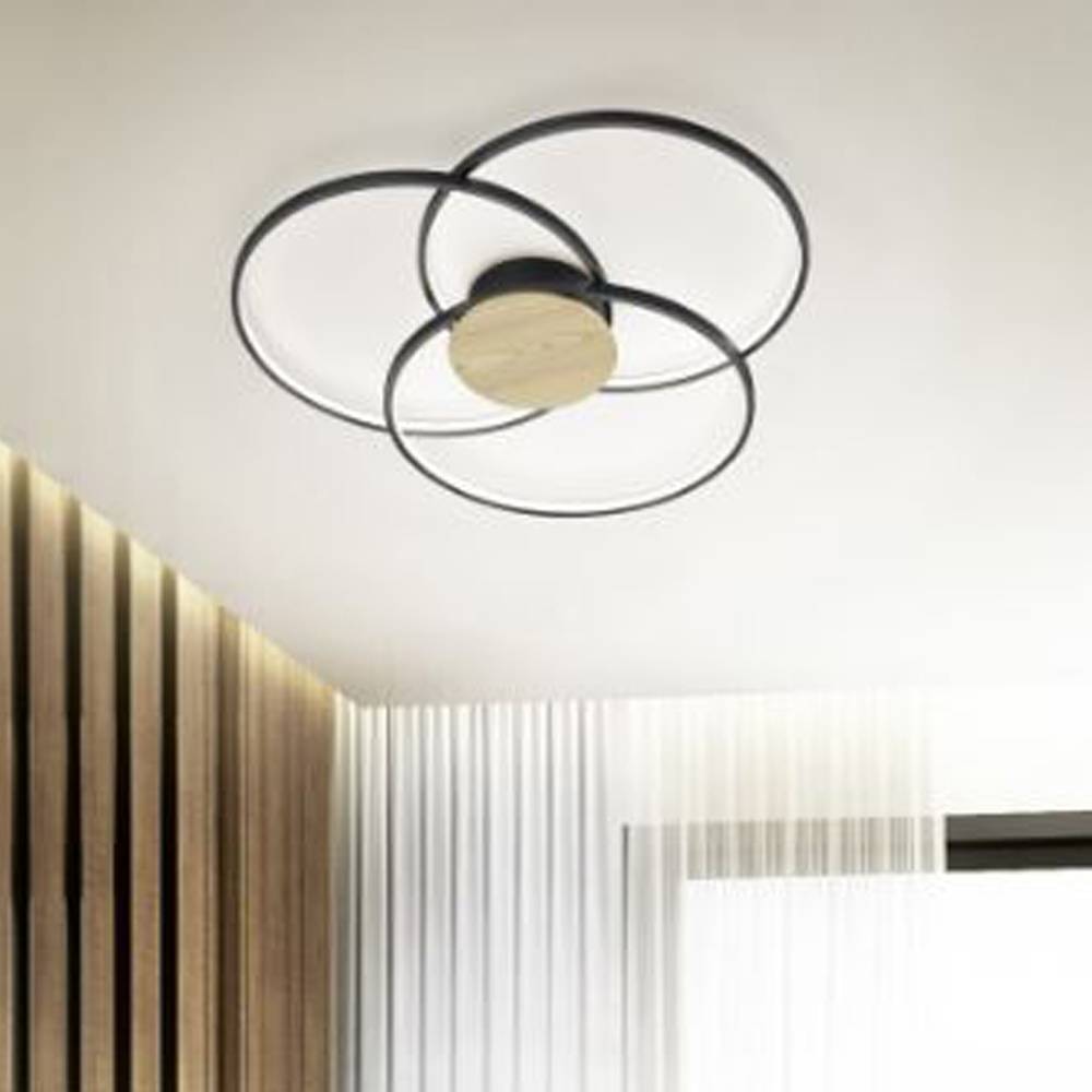 El plafón Sedona tiene un diseño moderno y original. Su estructura y aros que lo componen son de metal en acabado negro y difusor en acrílico blanco y un pequeño detalle en el centro en tono madera natural. Lleva integrado led de 40w consumo (3600lm). Su tonalidad de luz es agradable y emite una luz indirecta en acabado 3000k (luz cálida). Gracias a su diseño, desde el interruptor de nuestra casa podremos elegir la intensidad (3 niveles). Ideal para utilizar en estancias de estilo moderno como por ejemplo un dormitorio, un salón, un vestidor