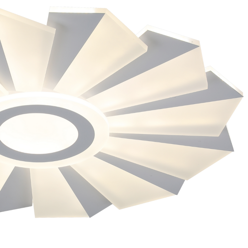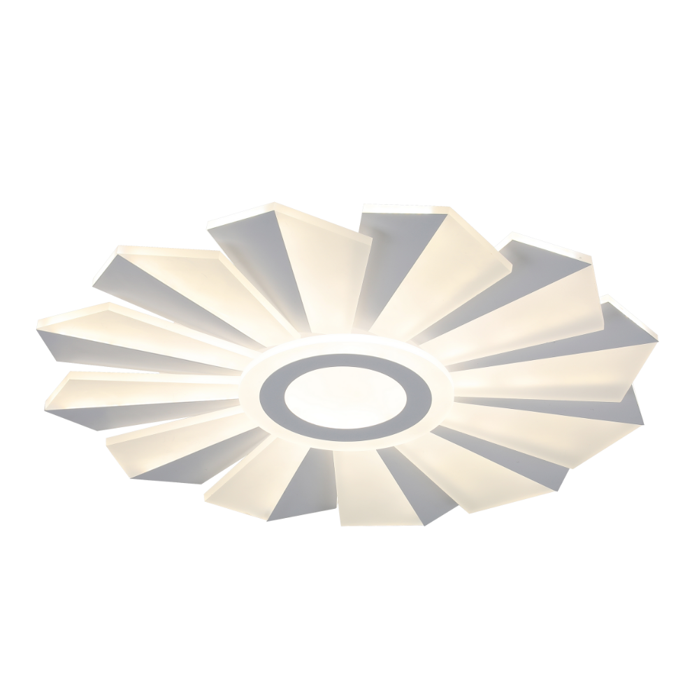 Plafón LED 58W con diseño floral moderno. Luz 3CCT regulable con mando a distancia. Acabado en metal blanco y metacrilato mate. Ideal para interiores elegantes.